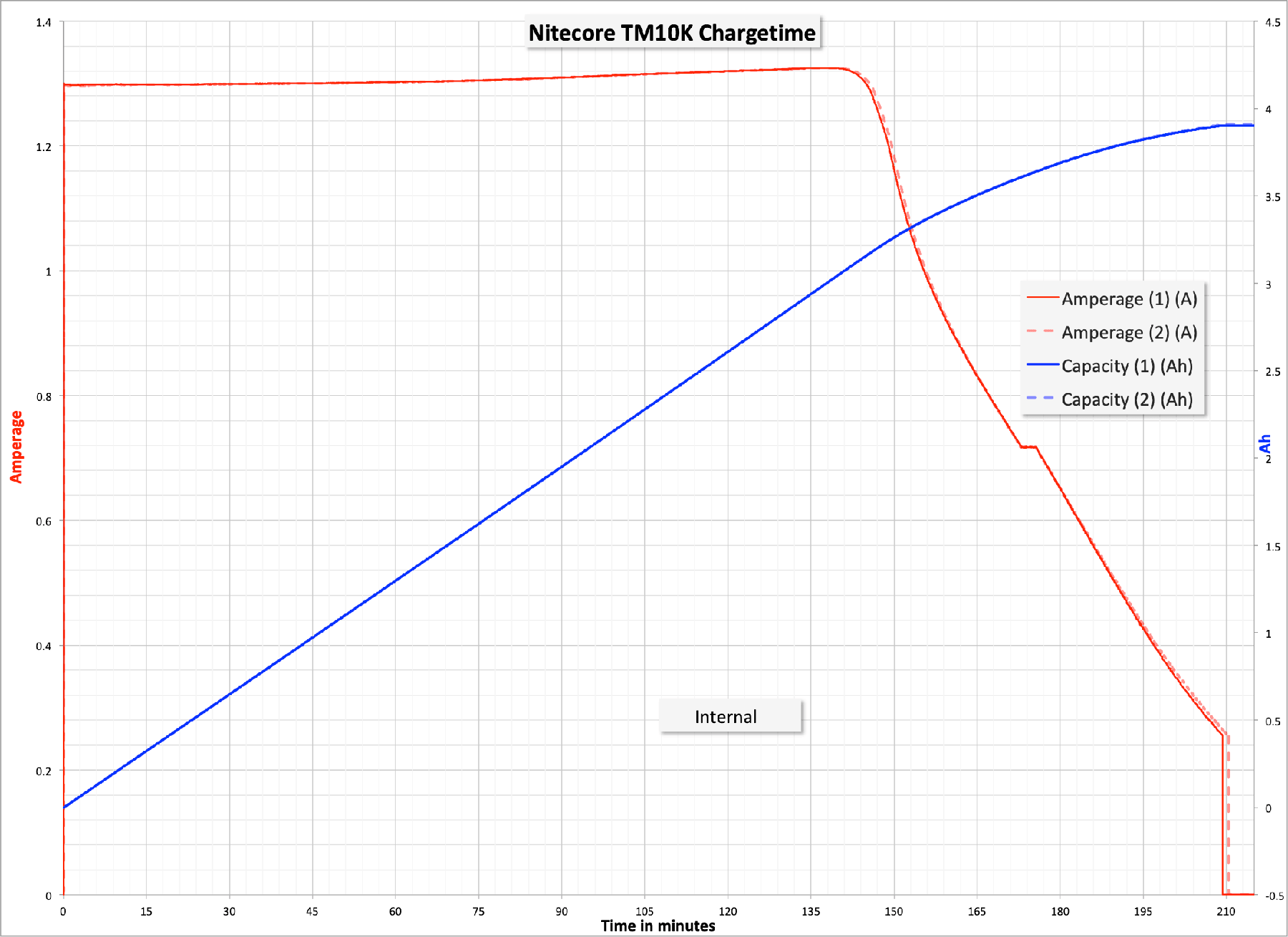 Below are two charge tests, so identical that it’s hard to even tell them apart. Charging proceeds at around 1.3A in the CC phase, and overall takes about 210 minutes. This also tells us that the cell capacity is around 4Ah. Not bad at all.
