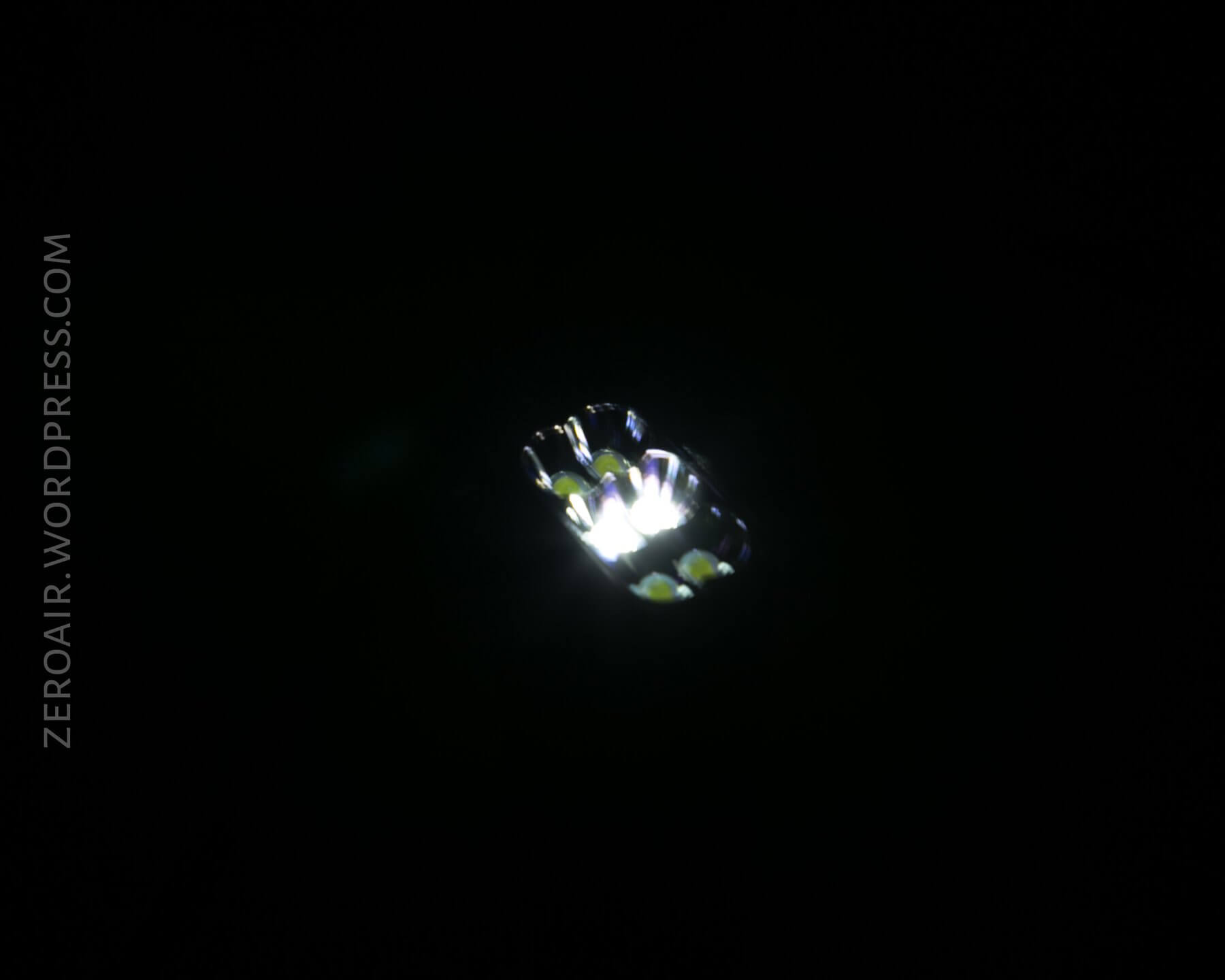 The emitters (six) are Cree XHP35 HD’s. That’s a good choice for high-output lights. The very shallow and incomplete (ie not fully round) reflectors are smooth.