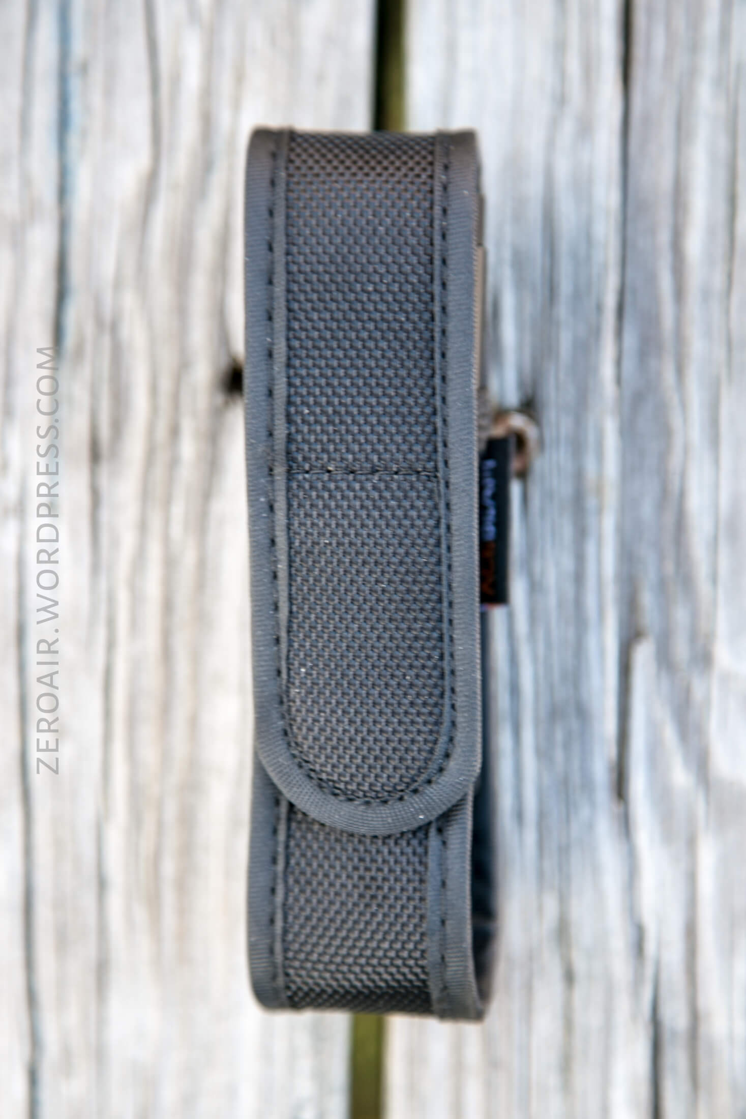 Acebeam includes a nylon carry pouch, with stretchy sides and a velcro cover. There’s a metal D-ring on the back and a snap closure. It’s a nice pouch, and the light will fit in head or tail first.