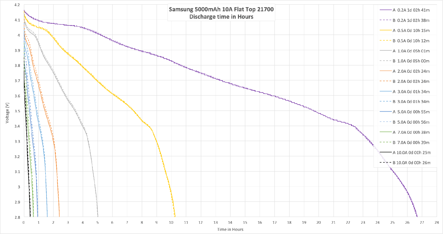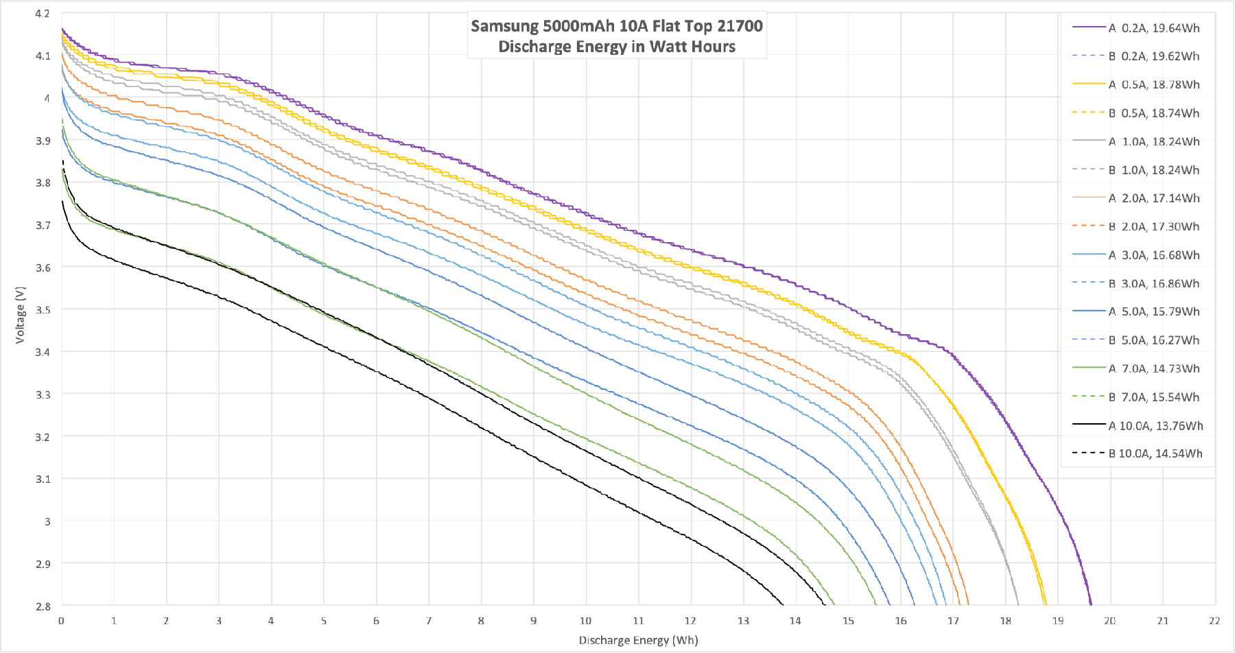 This is a new section, and I added it just because I think it’s interesting. “Bounce back” is what the cell voltage does when the cell rests after a discharge. Interestingly, after heavy discharge rates, the cell bounces back higher. This corresponds to a discharge amount of less energy, and does mean that there’s energy left in the cell. So if I selected the cell with the highest bounce back (ie the cell that was discharged at the highest current), then discharged it to 2.8V at 0.2A, I’d still find that there was a lot of energy still in the cell.