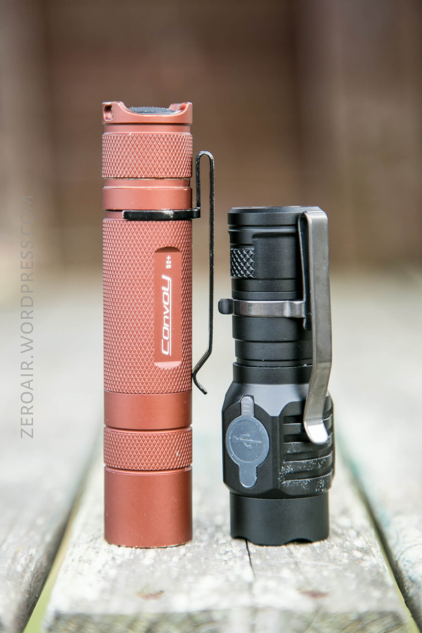 It’s longer than the Convoy S2+ in the 18650 format, and much shorter in the 18350. Here’s the test light with the venerable Convoy S2+. Mine’s a custom “baked” edition Nichia 219b triple. A very nice 18650 light.