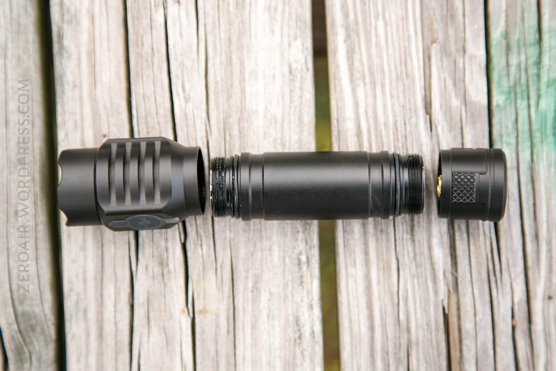Here are the 3 main parts. Head, tail, and 2 cell tubes. The cell tubes are directional and have anodized, well-lubed threads, which allow mechanical lockout.