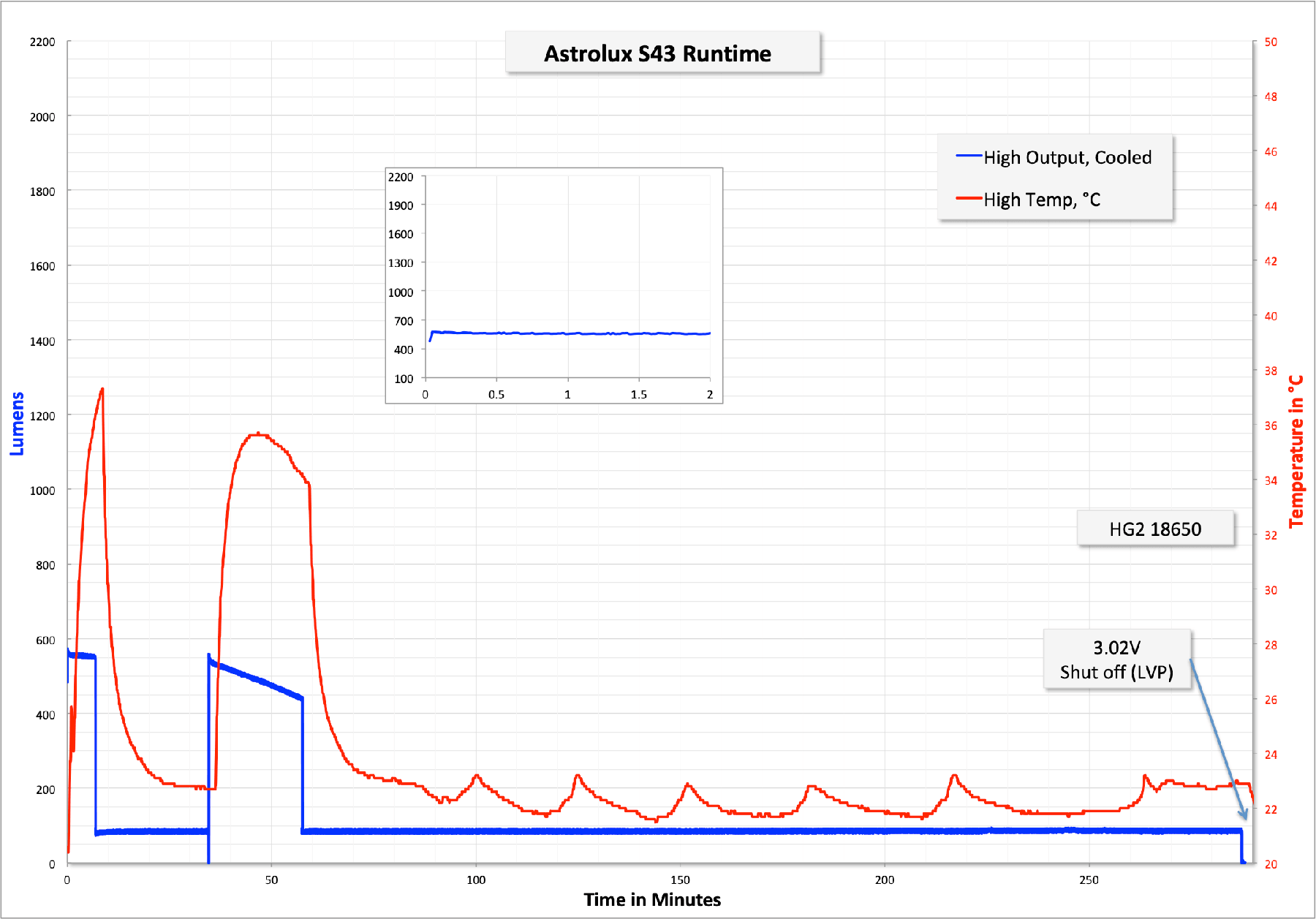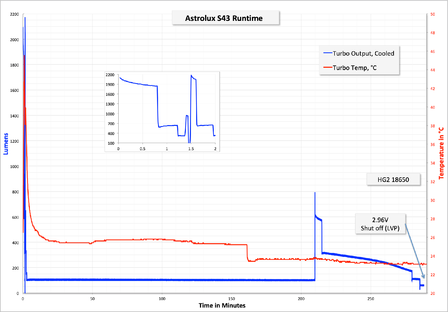 Here’s turbo. Turbo doesn’t last long and steps down hard. I flicked the light back up to turbo almost immediately, and the output was the same, but the duration was shorter. Later in the run, with a depleted cell, a turbo reset saw the output only reach around 800 lumens, and then the output stepped down, but not quite as hard. Likely due to thermal reasons. The light does have LVP, and my test saw the light shut off at 2.96V.
