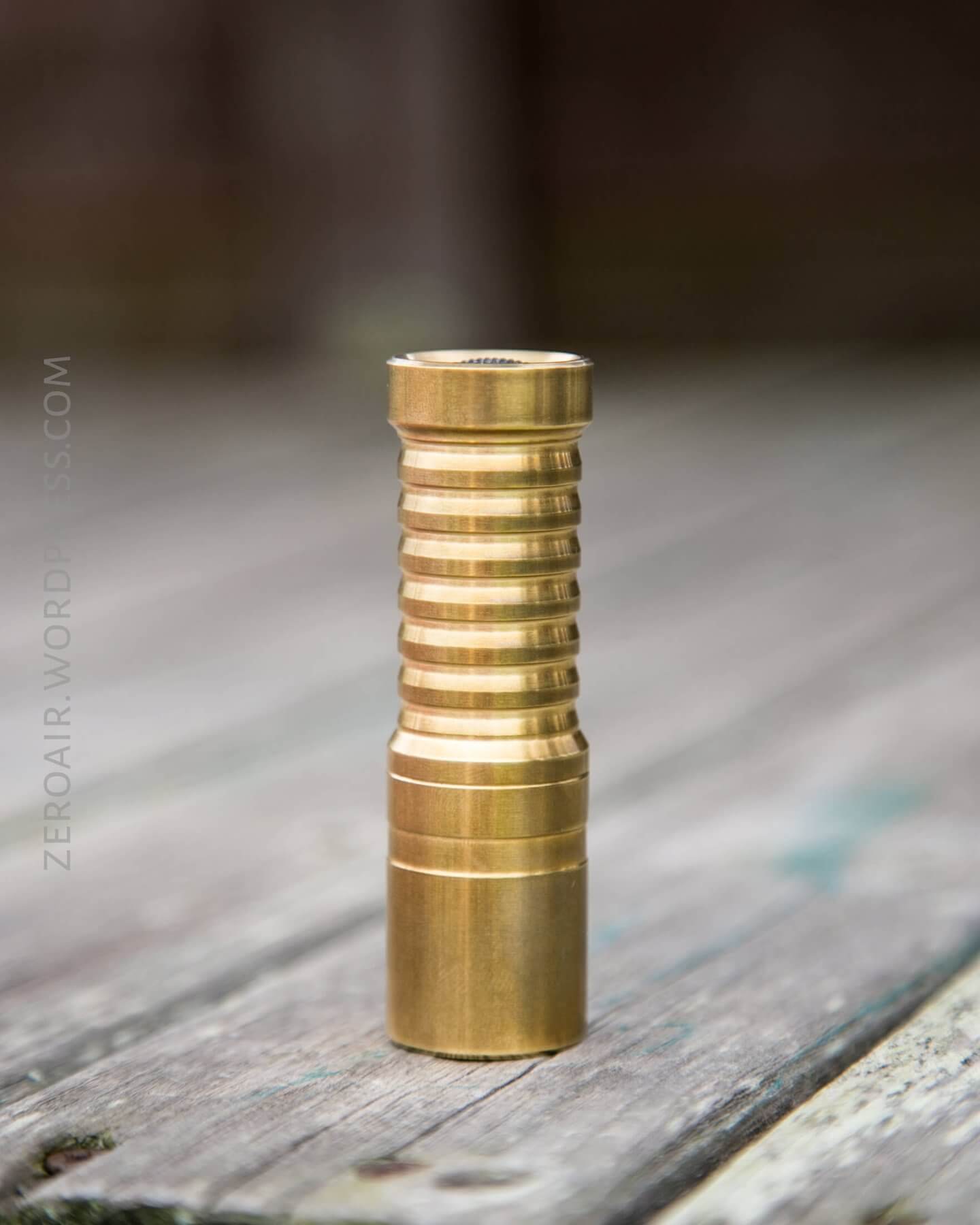 The tail has a spring, and the head has a brass button. Notice that the pill is solid copper. And that’s why this light is heavier than the BOSS – there’s a lot of copper there. If this pill were aluminum (and I don’t think that’d be a bad choice), then this would likely be the lightest brass 18350 available (which would be great!)
