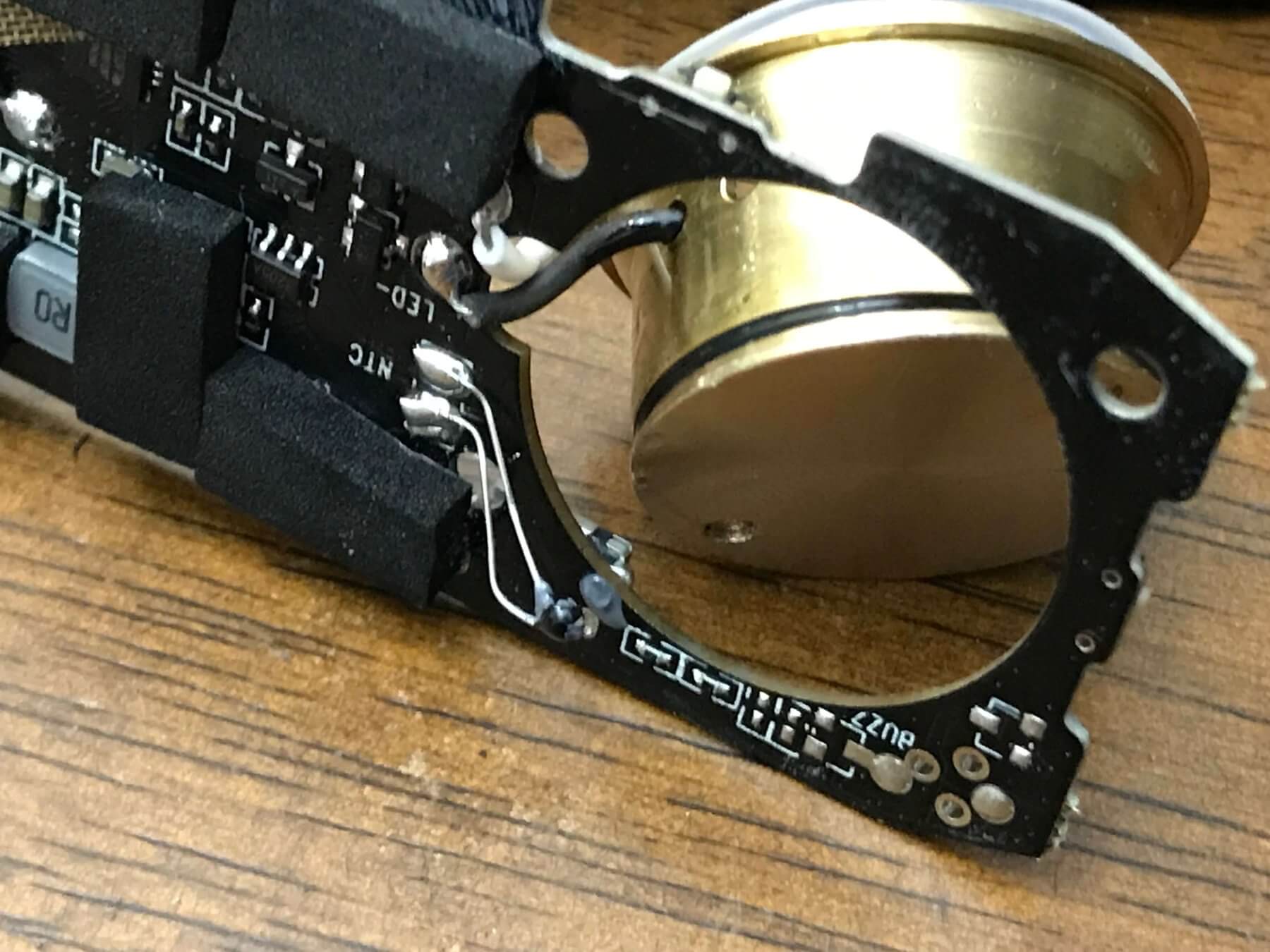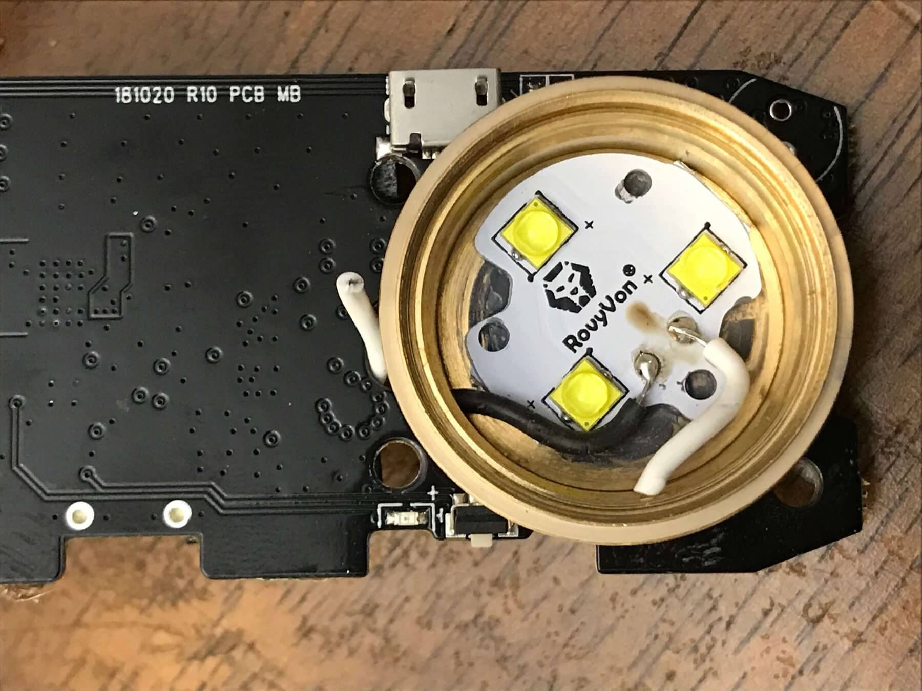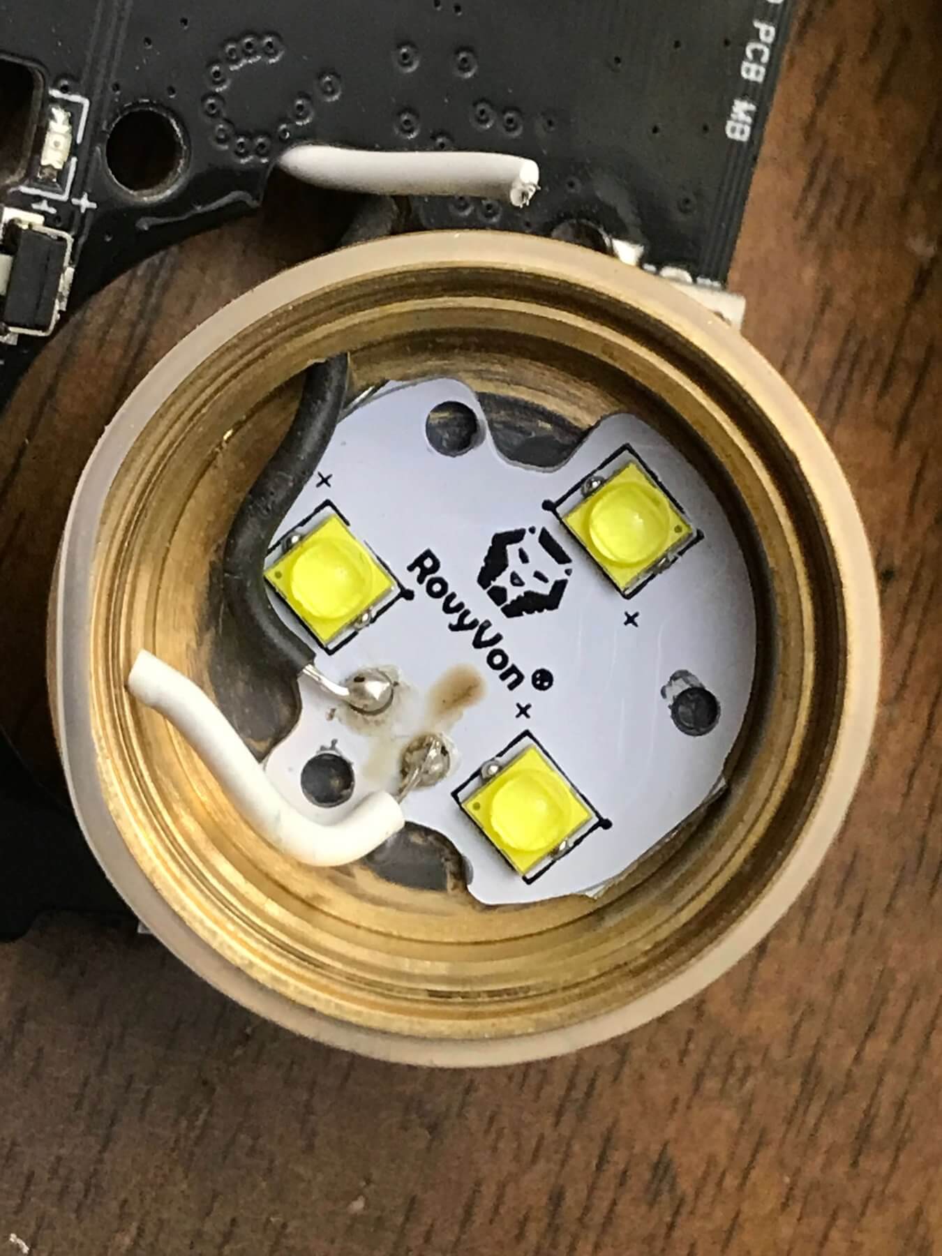 The MCPCB is thermal pasted down, but not glued. Easily removable – I’ll swap out these XP-G3’s asap.