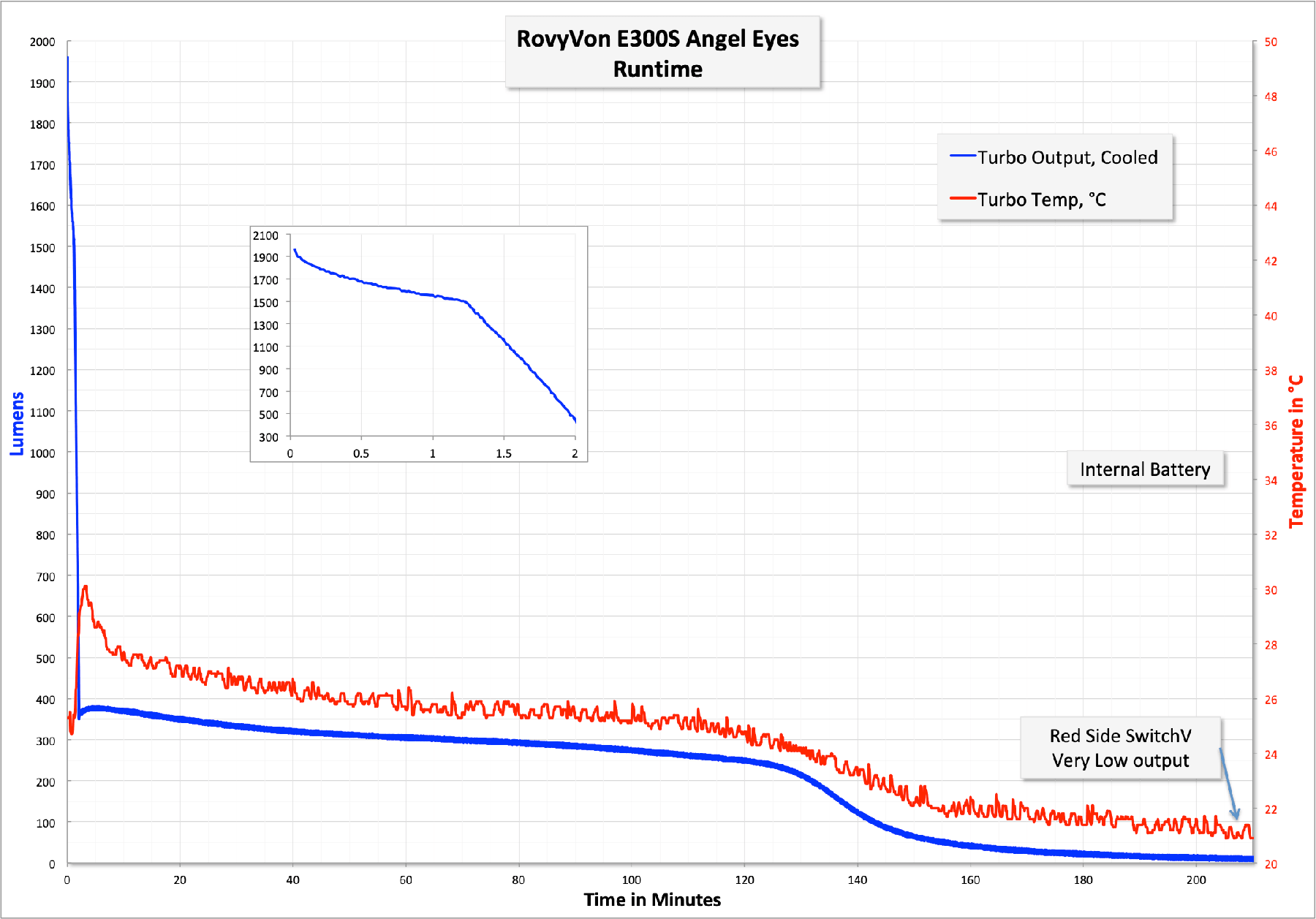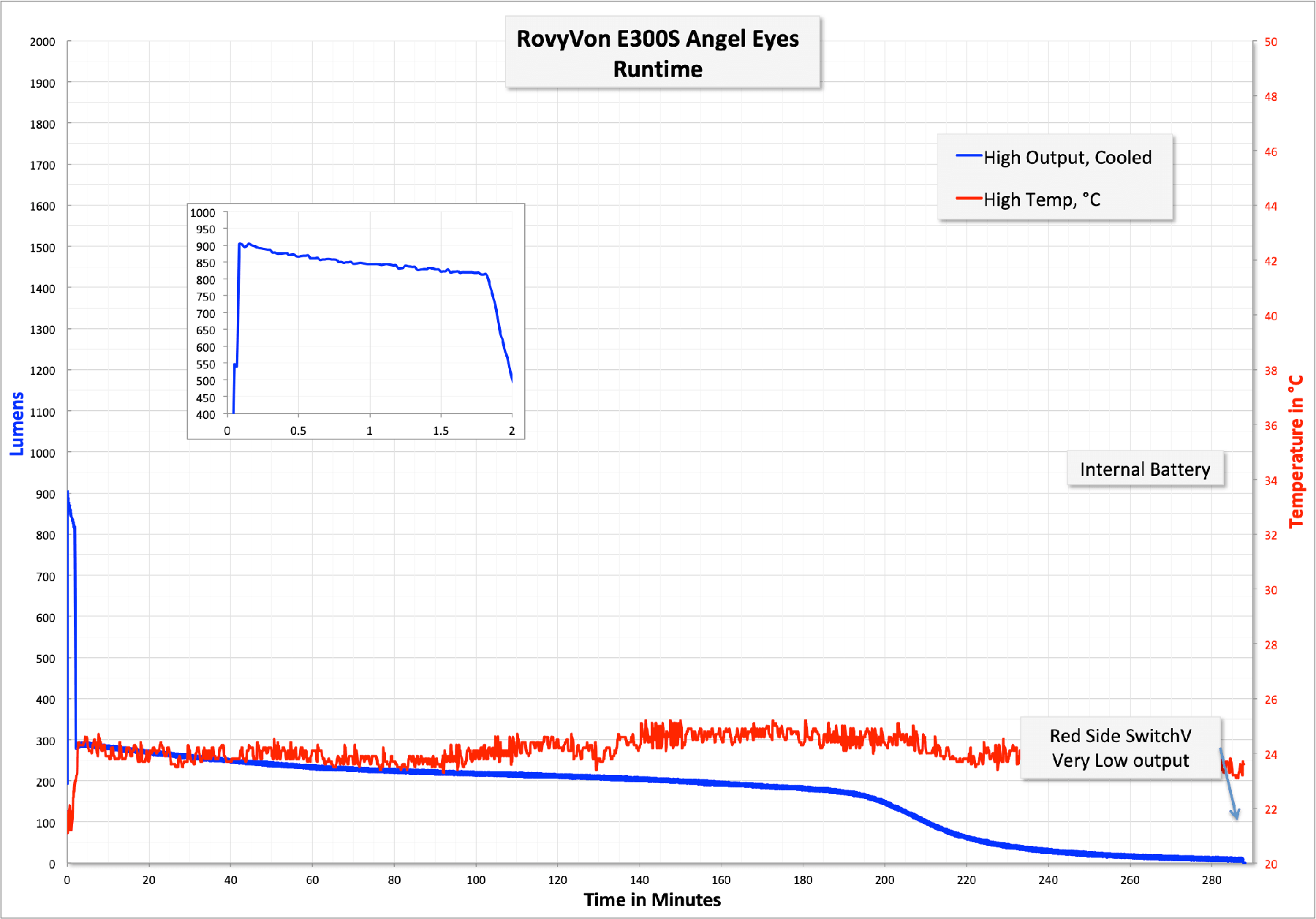 High looks about the same, and also has a noticeable stepdown, this time a little bit later. After that, the graph looks about the same as with Turbo, but at a lower output. The difference in output after the stepdown is actually specific, per the manual. Turbo steps to 350 lm, and High steps to 250lm.
