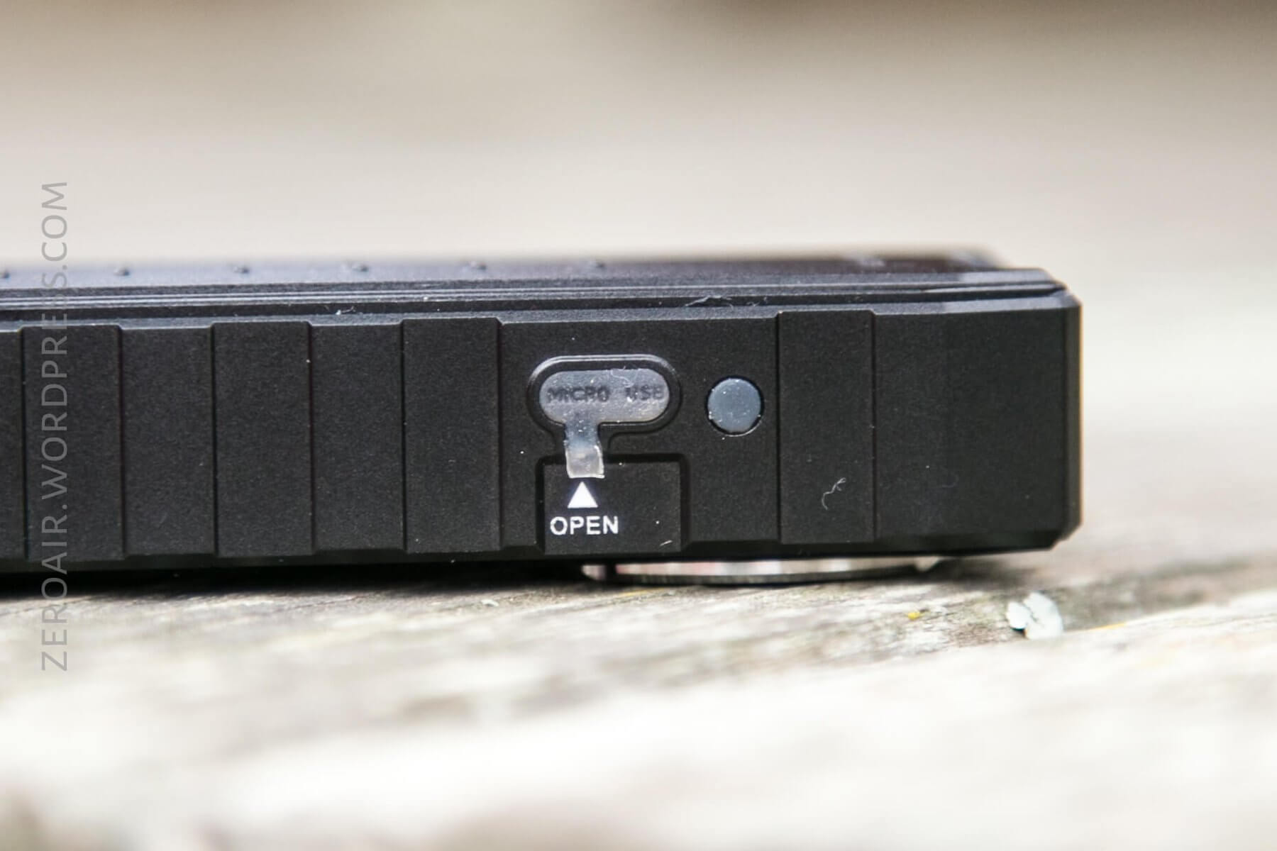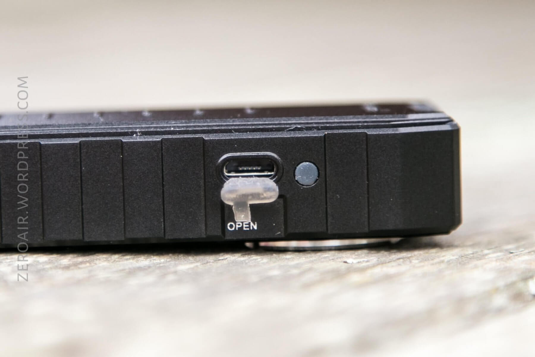 With the internal battery comes built-in charging. There’s a micro-USB port on the side, plugged with a rubber cover just like on the Aurora series. (A spare cover is included.) Beside this port is a charge indicator.