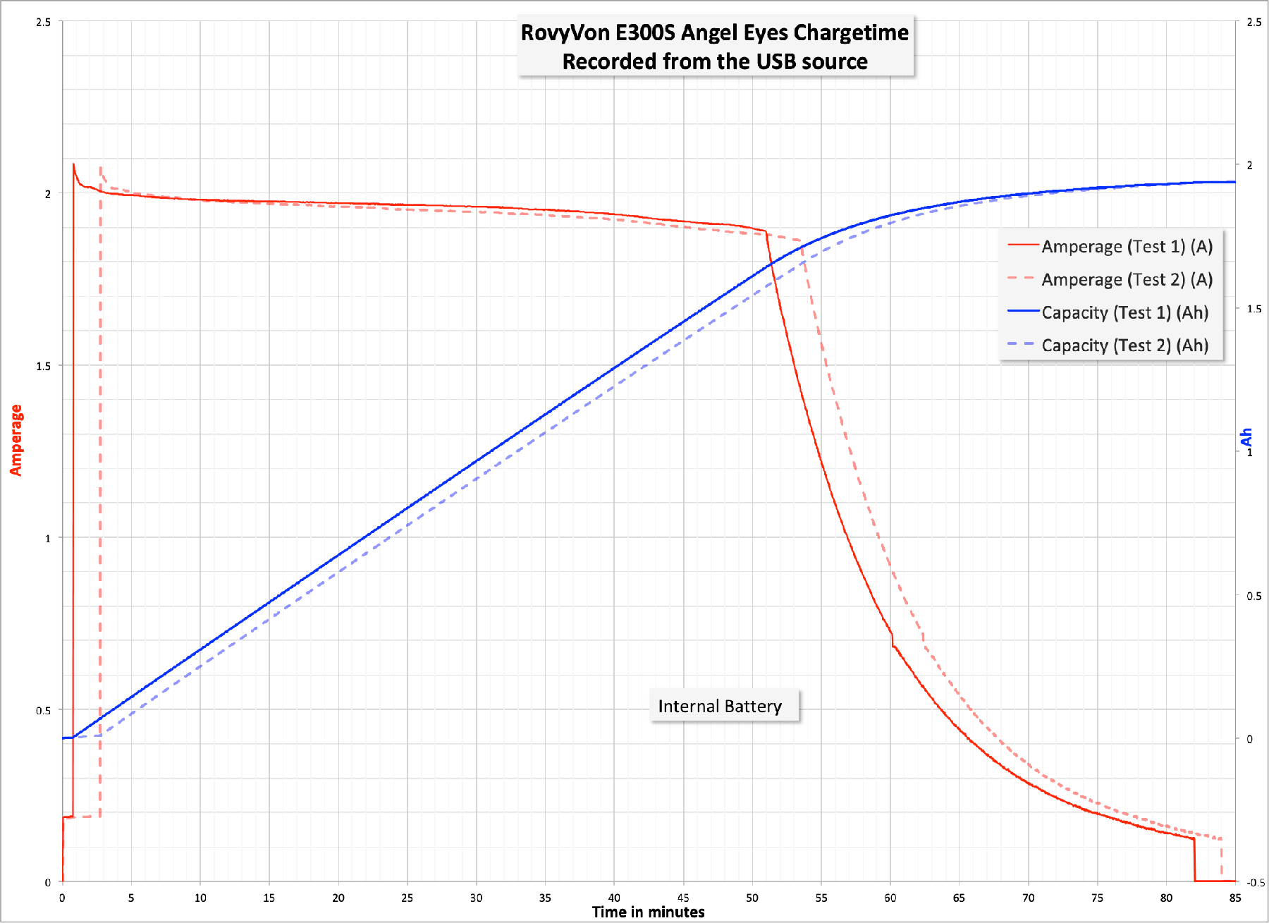 Charging looks quite good, and is surprisingly over 2A to the cell. That’s probably not too much for the small cell, since the output at Turbo is likely draining it at a much higher C. Charging is quick, at just under an hour and a half (!!). The indicating switch over the charge port “breathes” blue and red when charging, and turns solid blue when the charge is complete.