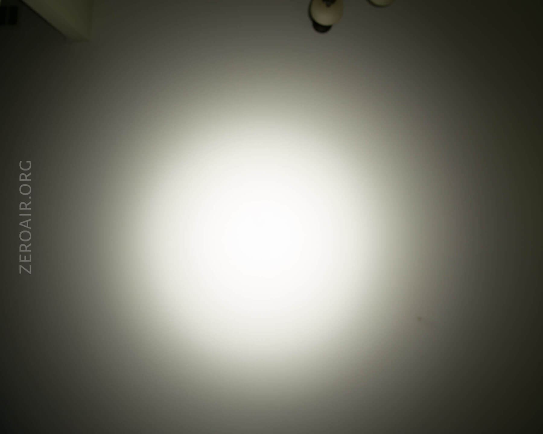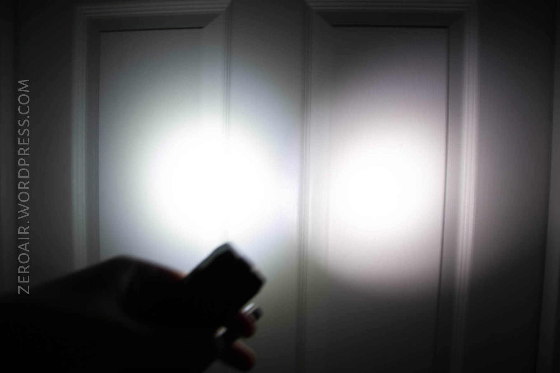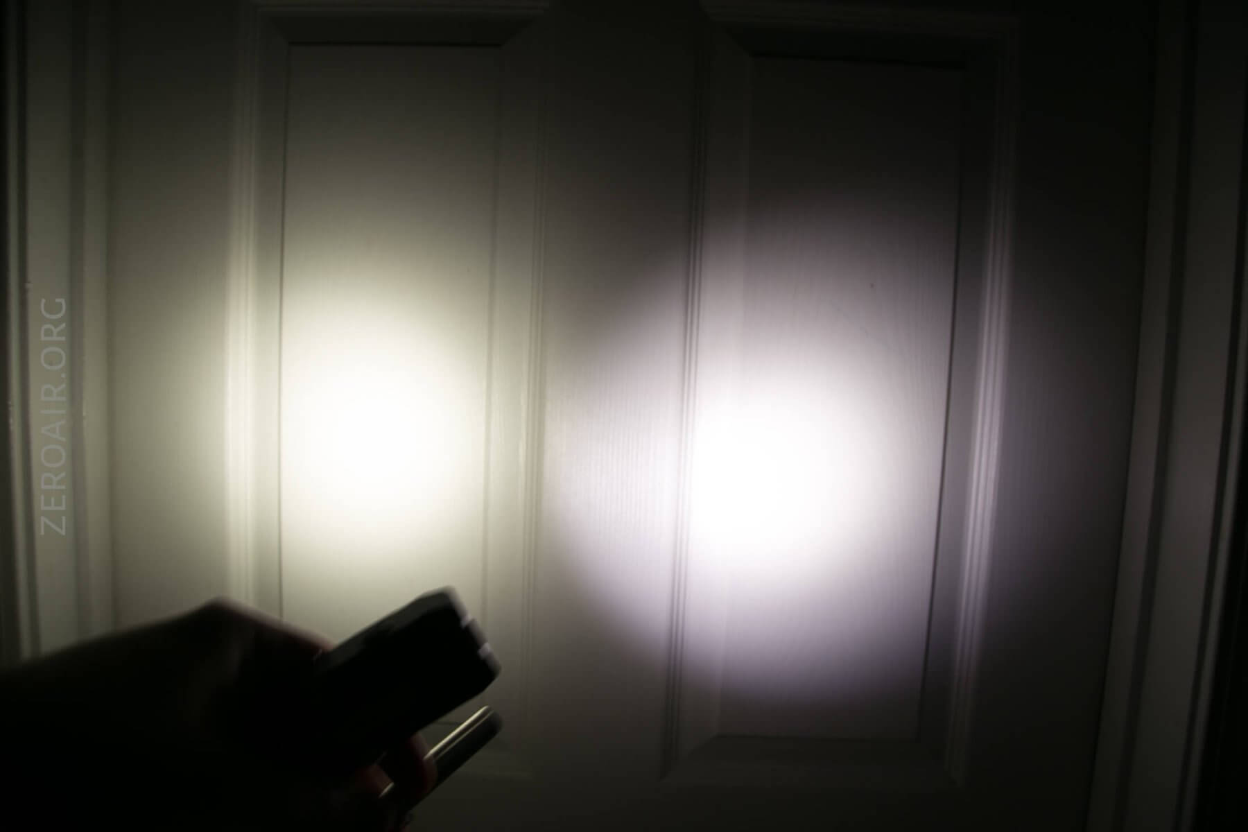 The blown-out nature of the beam center in the photo below disguises the tint of these XP-G3s. I think that’s literally the first time I’ve ever said that the test light beam looks better in the photo than in real life! I keep the test flashlight on the left and the BLF-348 reference flashlight on the right.