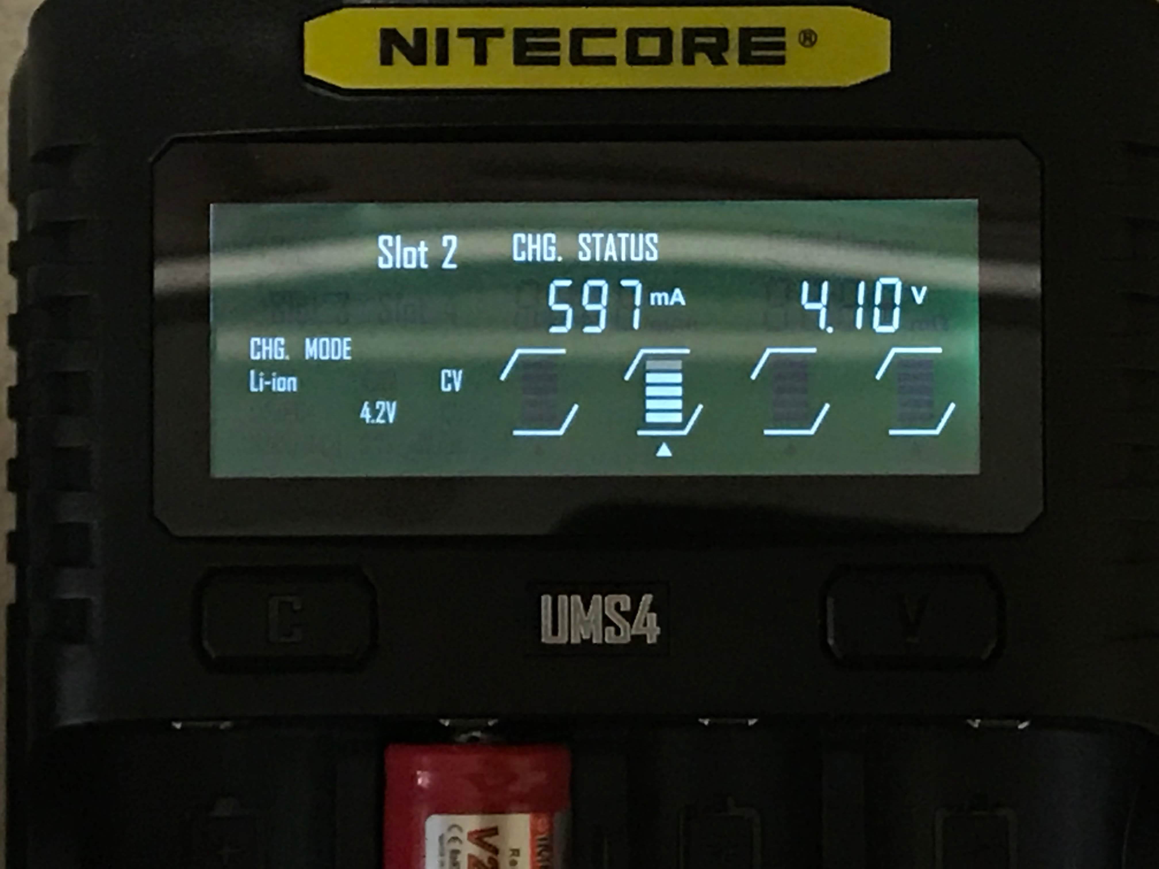 And here’s the UMS4, 1 bay in use, default charger current for an AA NiMH cell.