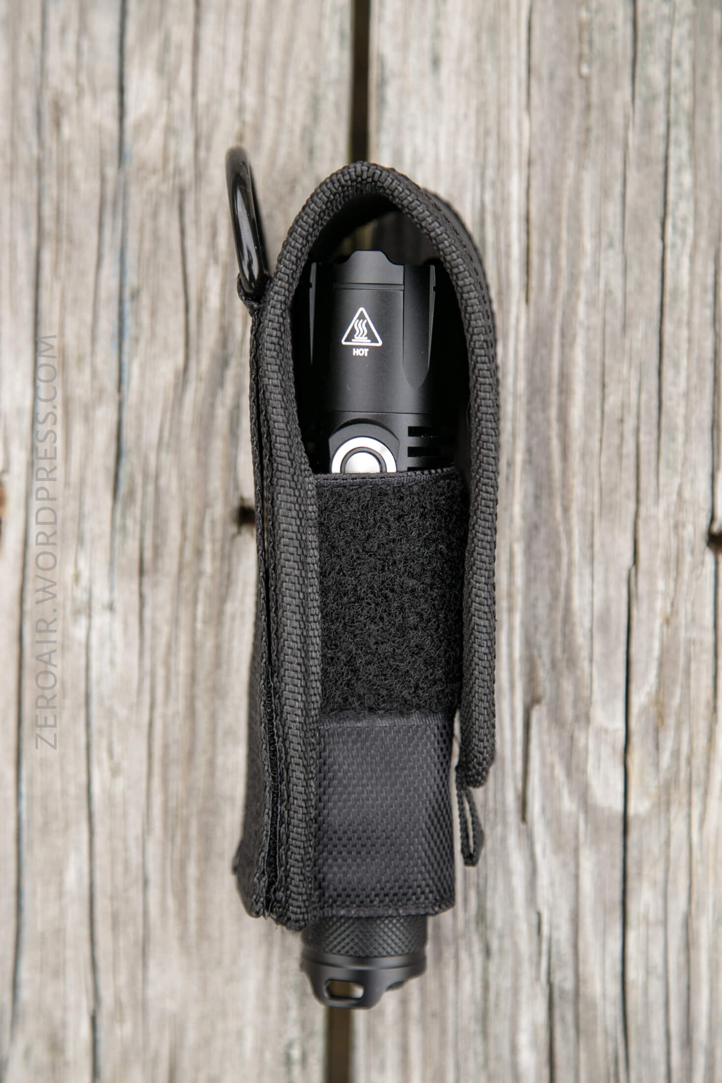 Nitecore includes a standard nylon pouch. The light fits primarily bezel up.