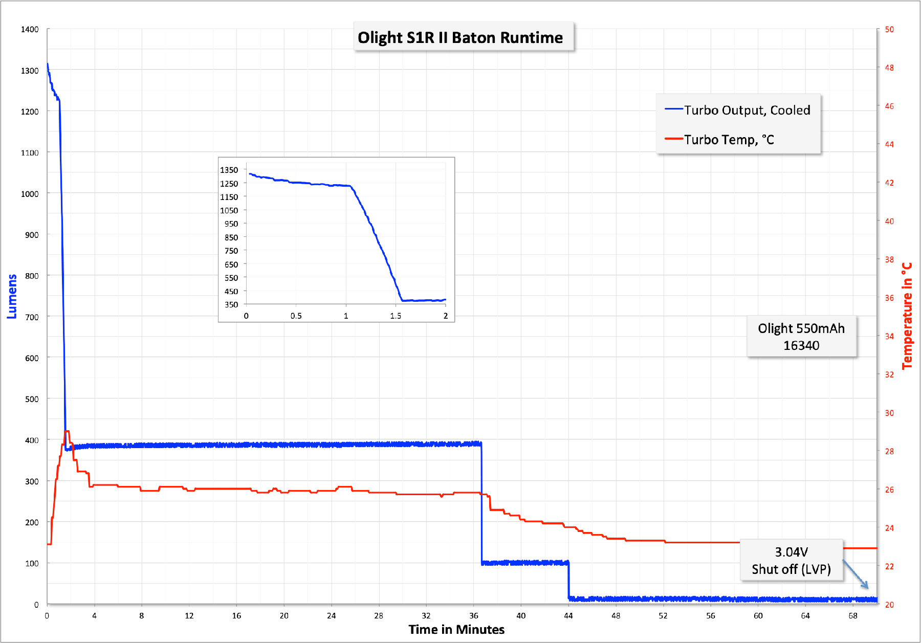 Turbo lasts more than the magical 2-minute window, which is nice, and with fairly minimal fade. At 30 seconds, the output is over the claimed 1150 lumens, at around 1370.