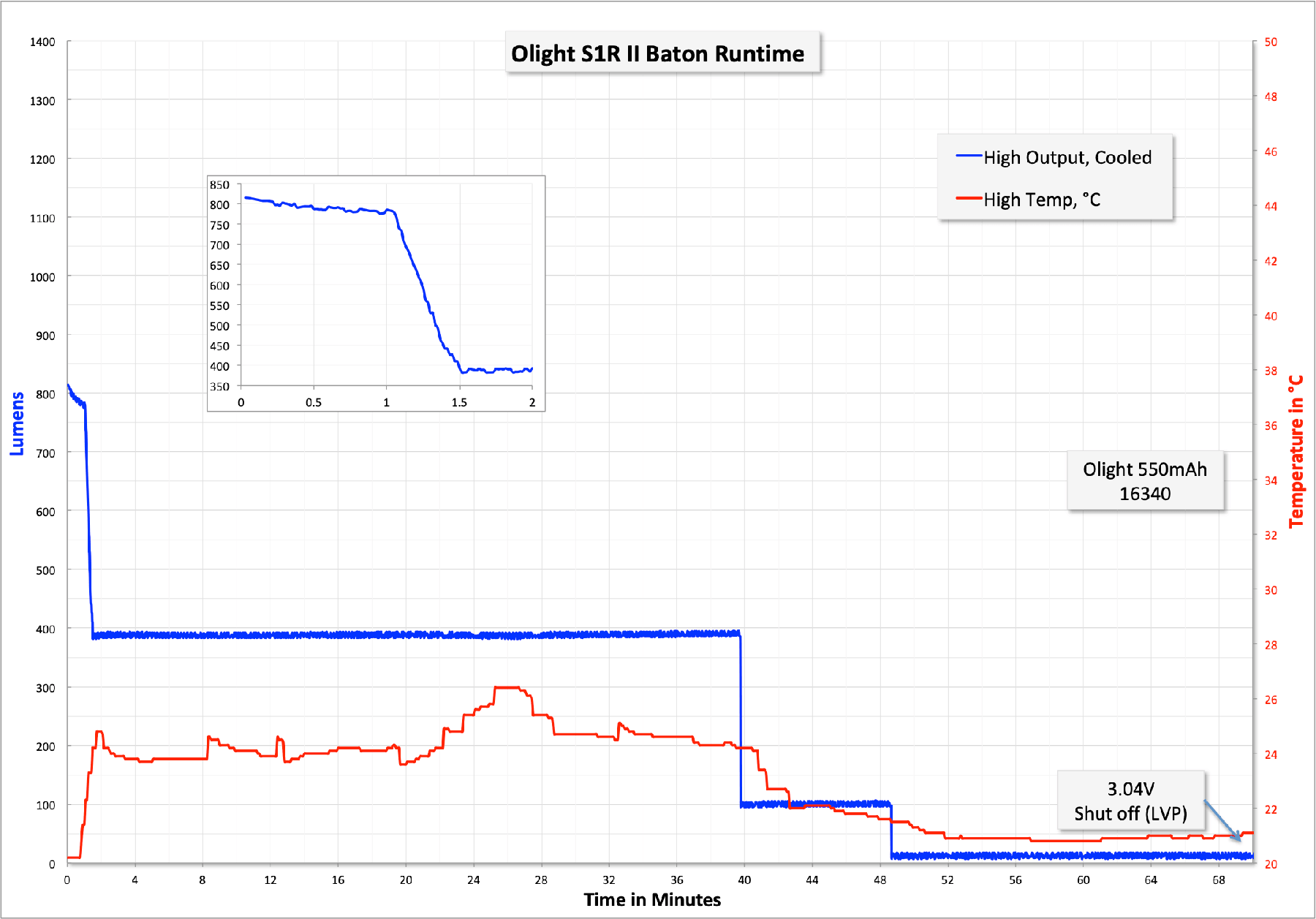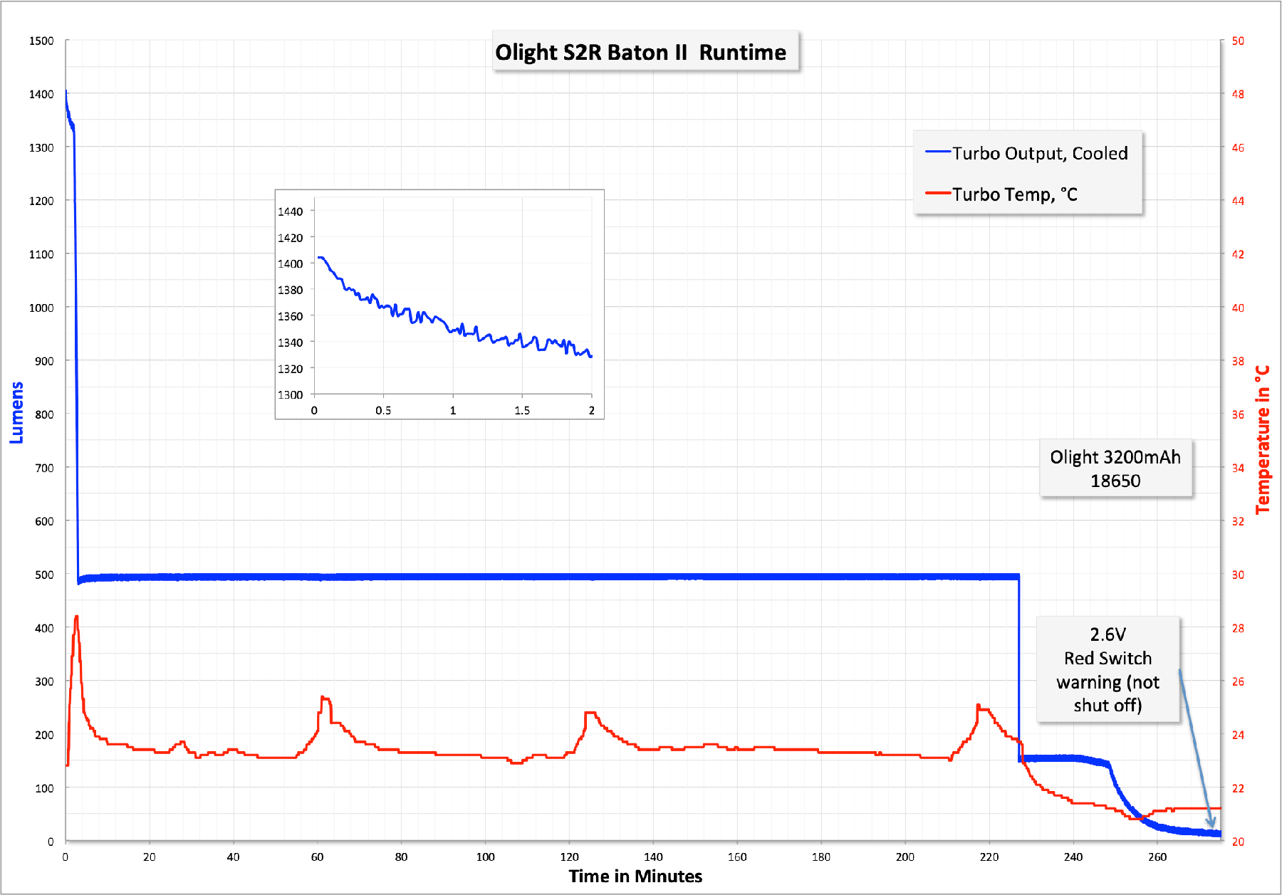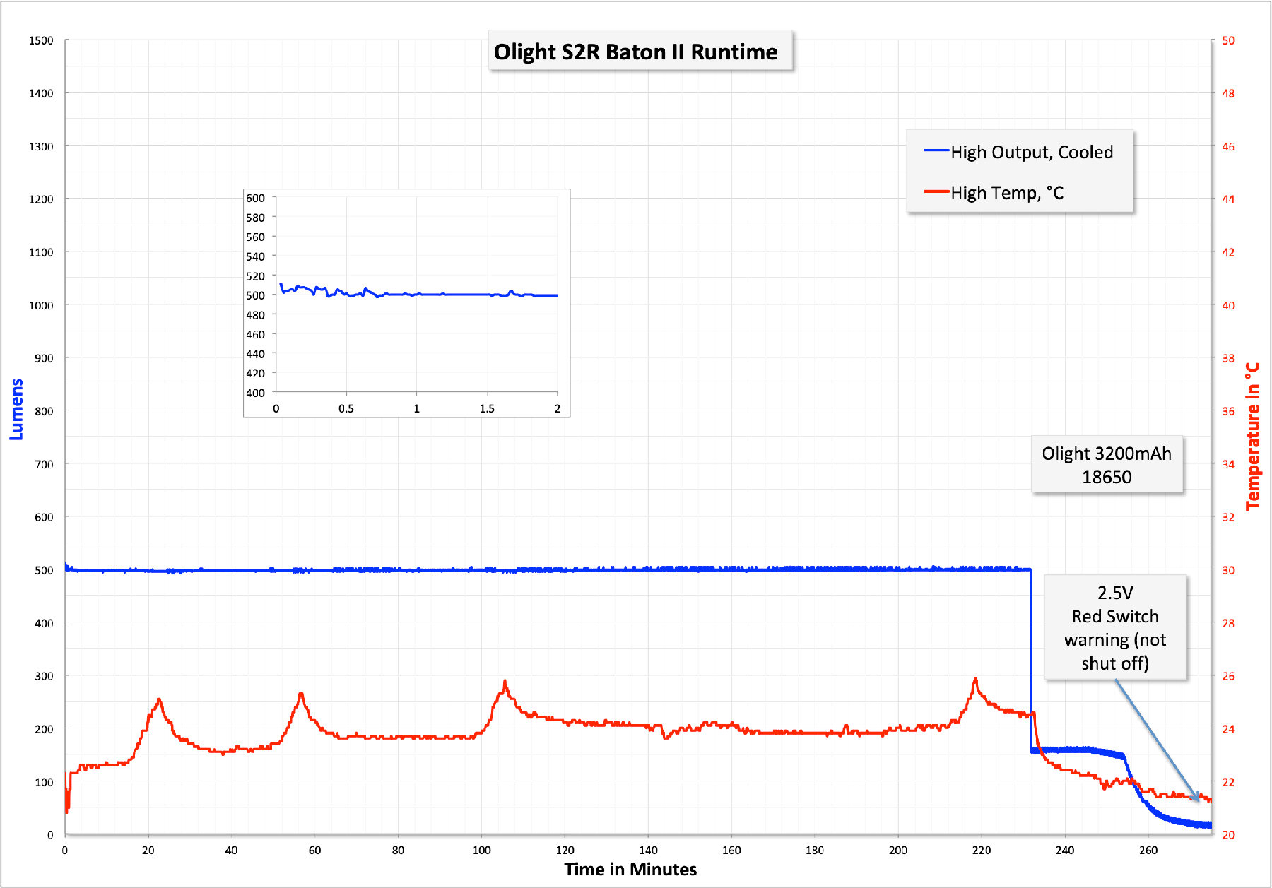 Unlike the S1RII Baton, this light does not seem to have low voltage protection. These two tests stopped at 2.6 and 2.5V, which is lower than I like to take my lights regularly. It’s certainly safe for cells at least occasionally, as that’s what most cells are taken down to for their rated capacity, but it’s not something I’d want to do regularly. (When cell testing, I stop at 2.8V!)