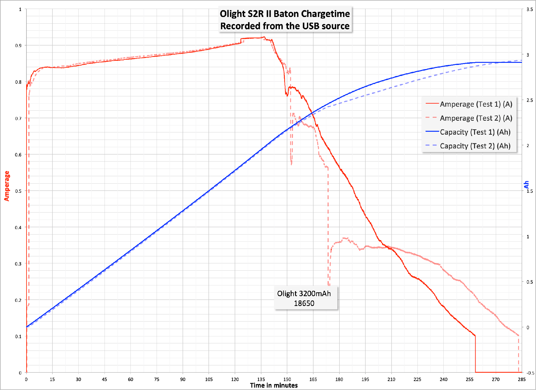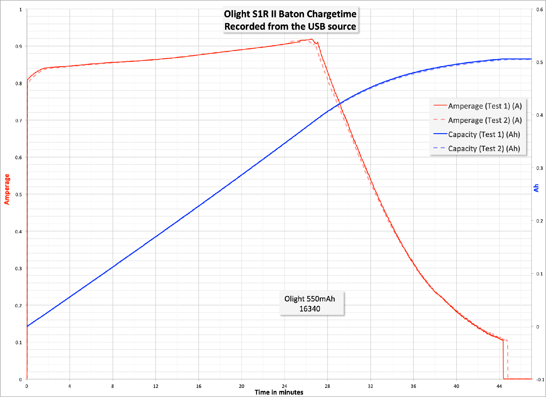 Two charge tests for the S1RII Baton. Very similar profile, with charging at over 0.8A. For a 16340, that’s a shade high.