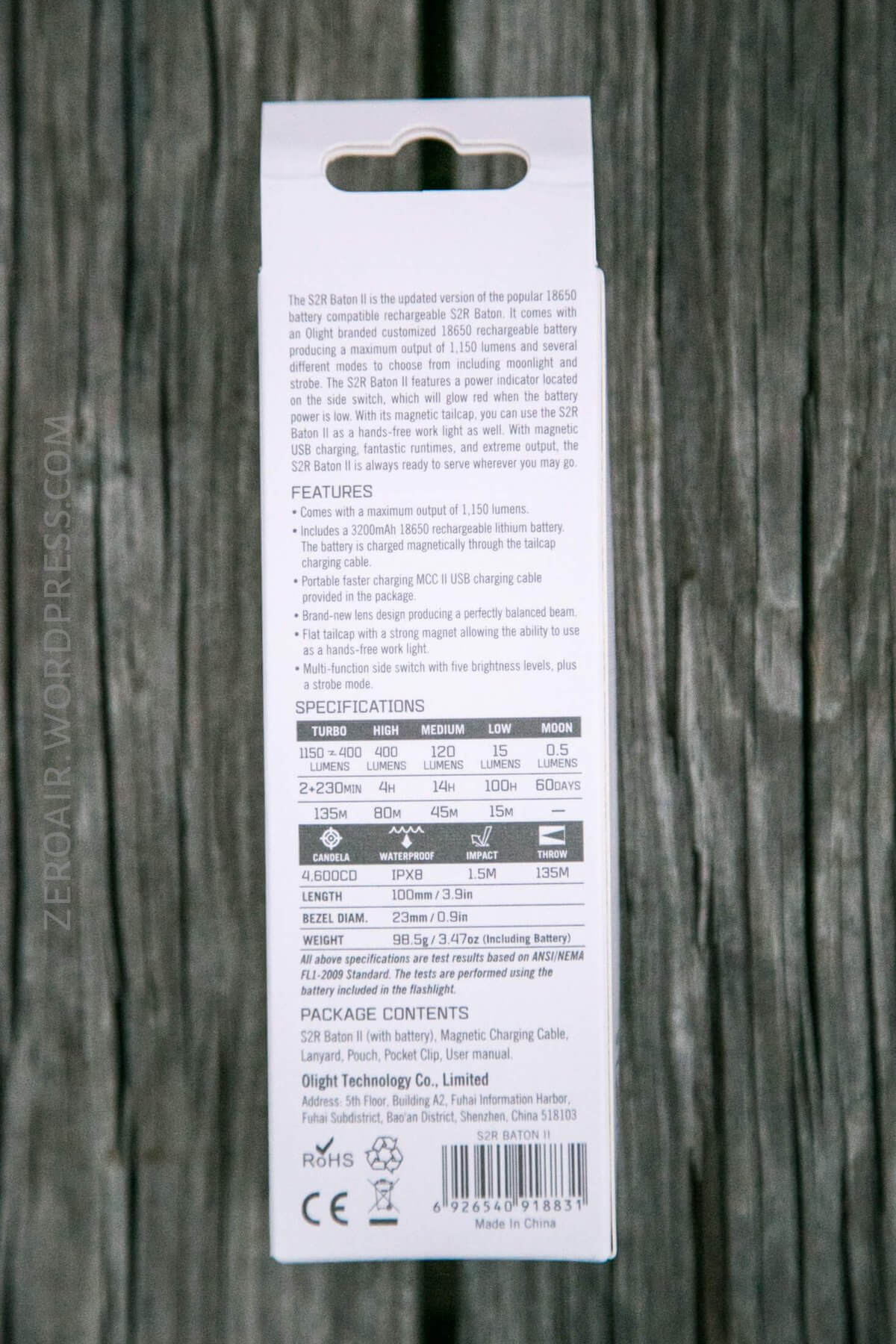 Standard new Olight packaging. It’s a tear strip box with a serial number, and very dense packaging (i.e., it’s impossible to get these repackaged like-new).
