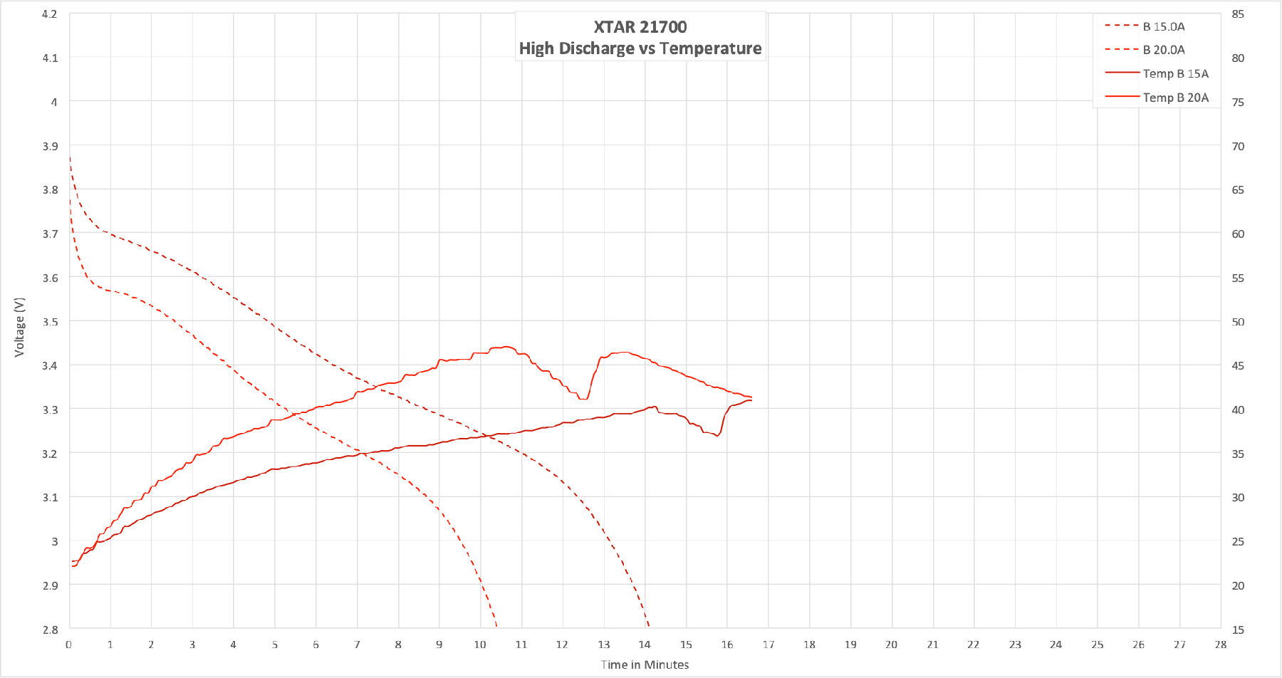 Here’s the temperature data. You should be asking why the temp (on both tests) dips after discharge completion, and then rises again. I can answer that. For a few minutes after the discharge at these high currents, my discharge tester has active cooling. It’s not cooling the cell per se, but the cell is, of course, near the tester. So for a few minutes, the fan is running, moving air around the cell, cooling it coincidentally. But once the tester reaches an acceptable temperature, the fan shuts off. The cell no longer has the air movement around it, and the temp creeps up because the center of the cell is still not cooled completely.