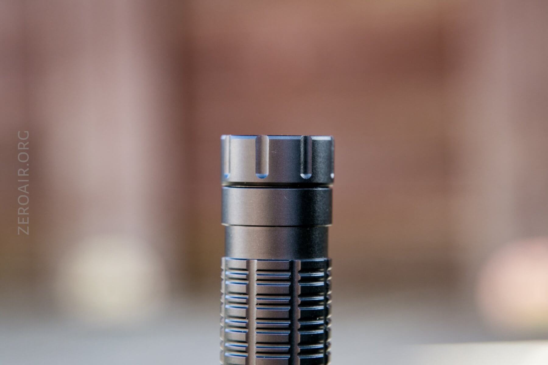 The tailcap doesn’t have much grip; certainly no reeding or knurling. But it’s not difficult to unscrew the tailcap. My copy of this light had minimal lube (ie, “just the right amount”) and the anodized square-cut threads are very smooth.