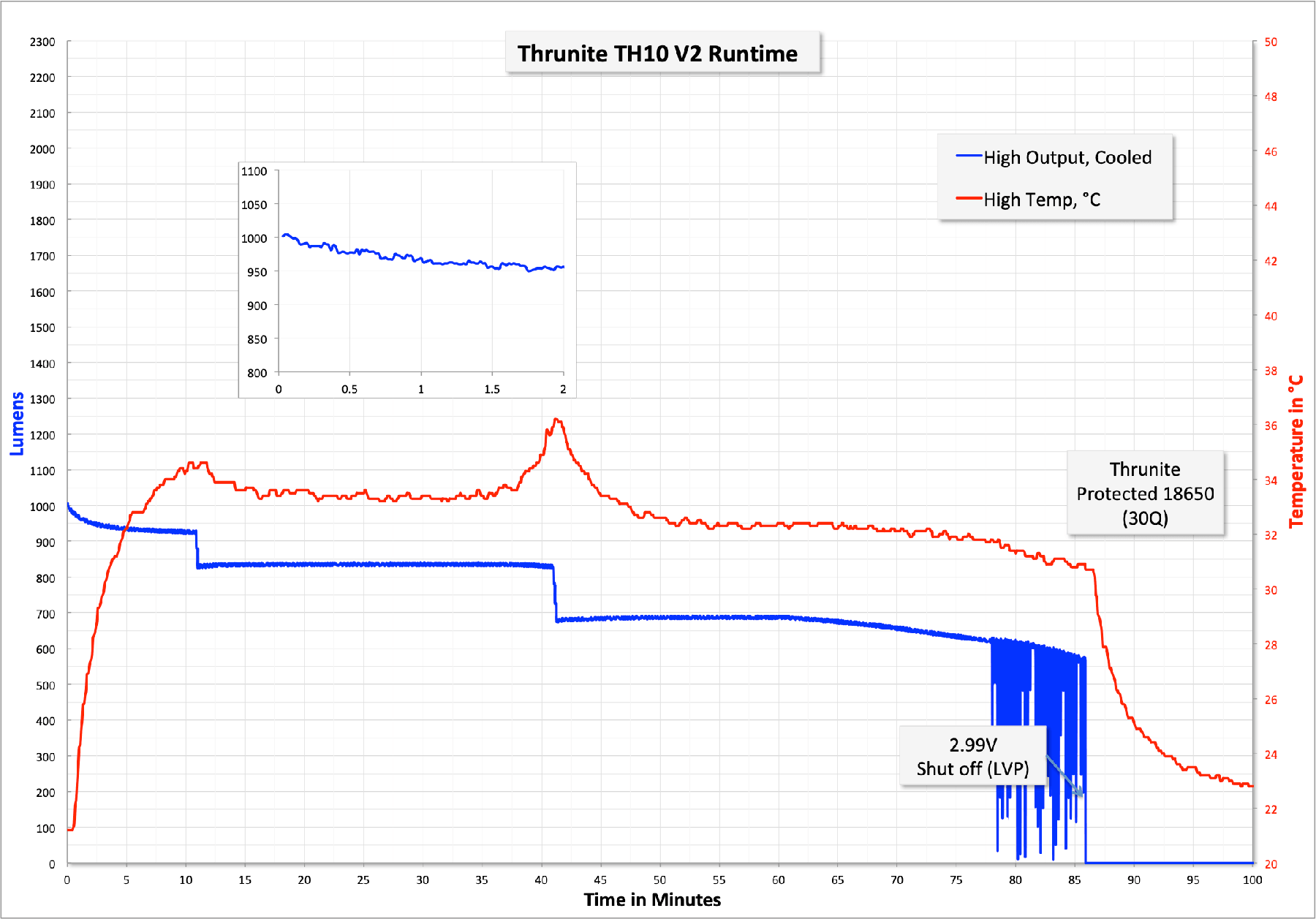 High is similar, except that the output remains stable for much longer (10 minutes or so), then steps down only minimally to ~830 lumens. Overall, this drives the light slightly harder on average, so the runtime is less. This runtime exhibited the same LVP.
