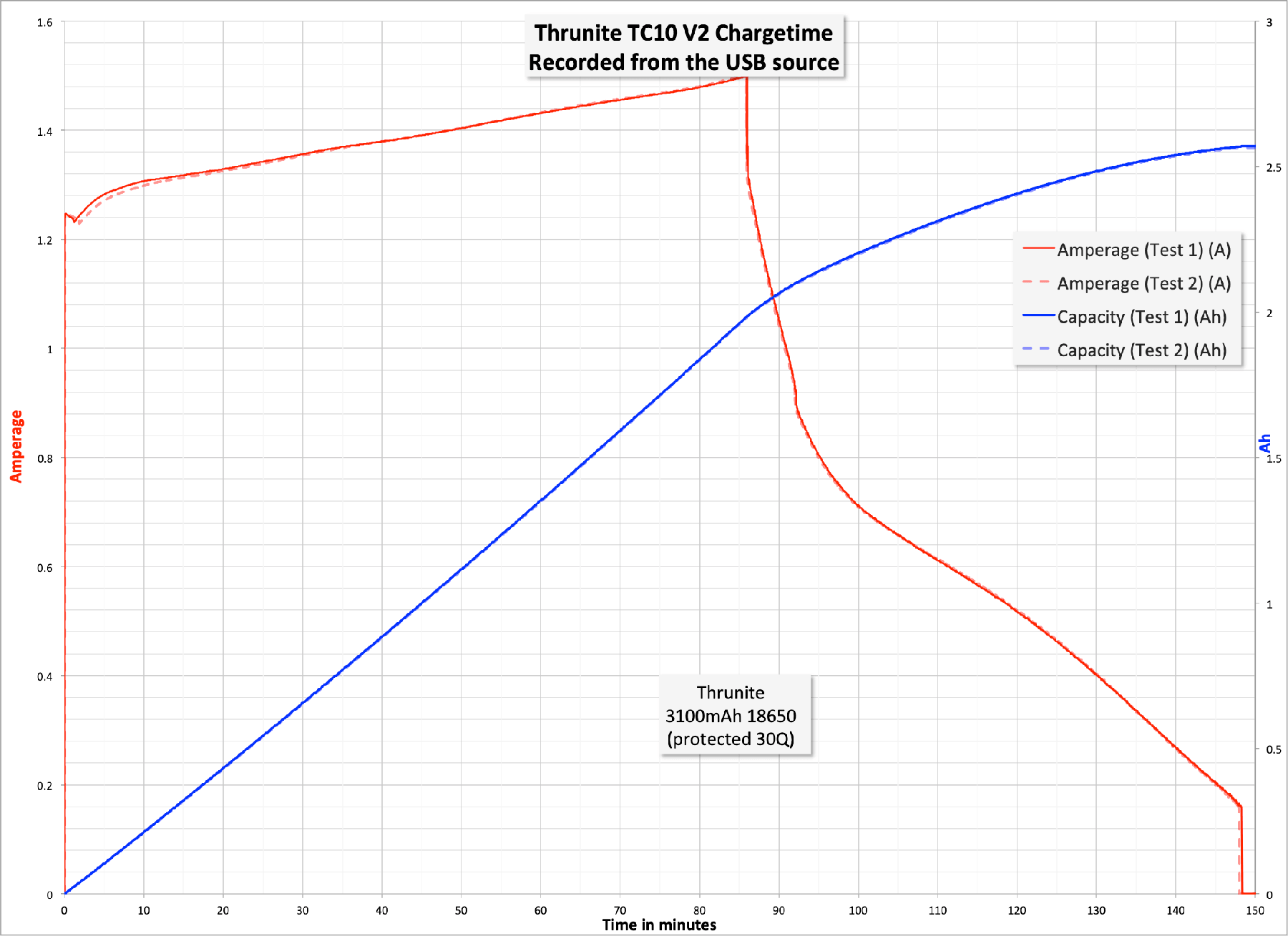 Here’s a charge graph from two charge events. They’re respectably similar, and charge from ~1.2A to ~1.5A during the CC phase. Charging takes around 2.5 hours.