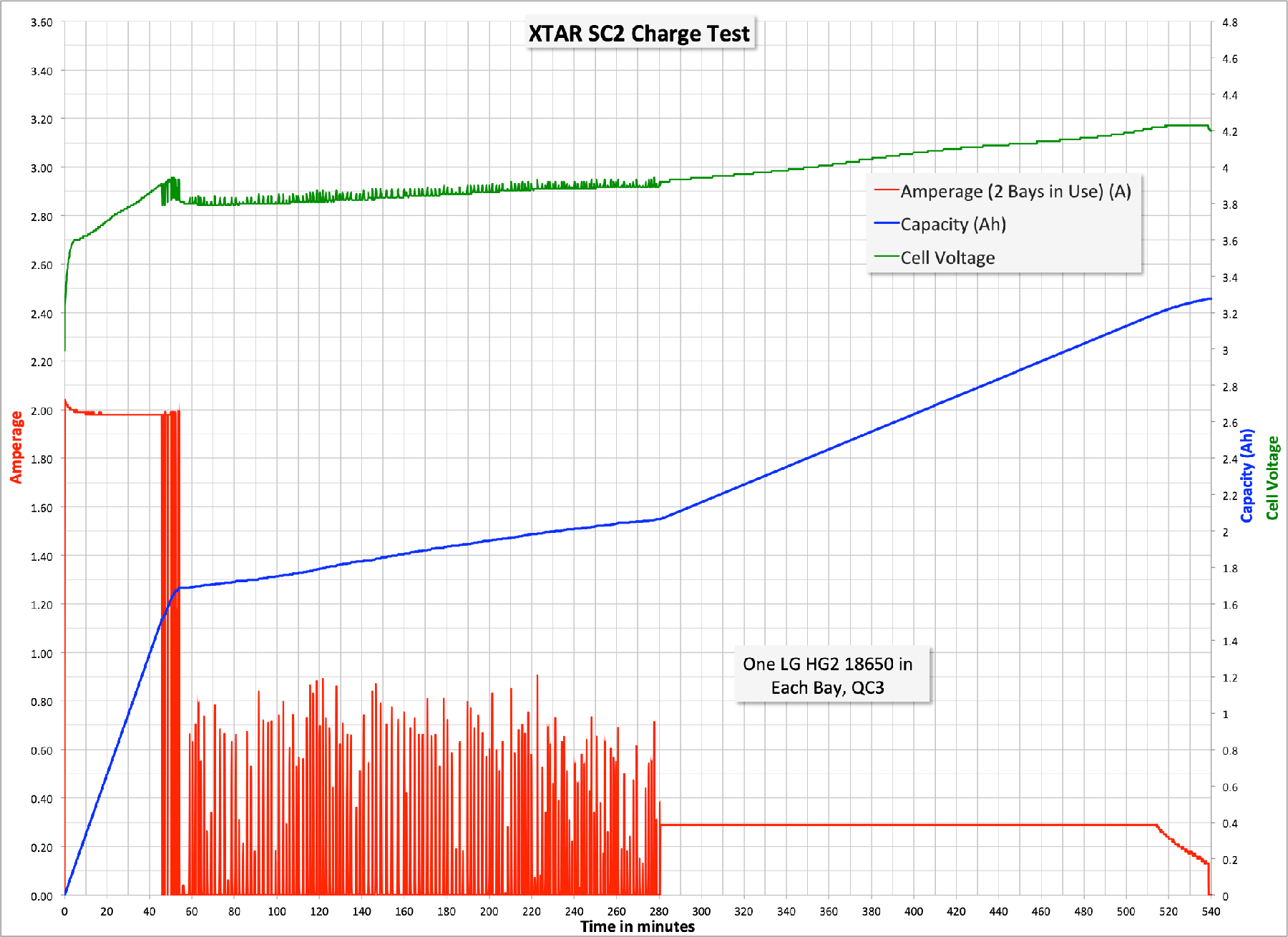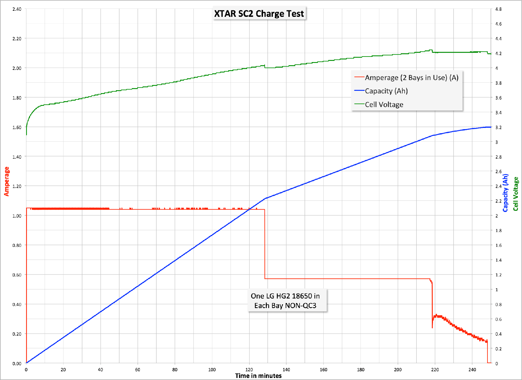 Here are some charge graphs. I tested with both 1 and 2 cells before I even had a QC3 port in my household, and then I got a QC3 port to test with. Here are the two non-QC3 charge tests: