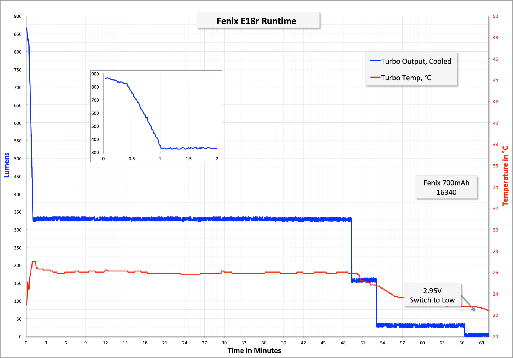 Here’s a test on Turbo. The output doesn’t quite last 30 seconds and begins a sharp decline to around 320 lumens. By 1 minute, the light has settled on its stepdown and is very stable from there. The light never properly shuts off, and in testing with the bench power, it does not seem to have low voltage protection. The included cell has a protection circuit, so undervoltage shouldn’t be an issue with the included cell. There’s also a low voltage warning in the switch around 3V – the switch flashes red. Interestingly, the switch warning fades as the voltage decreases, but the main emitter output is very stable all the way to [cell death]. The claimed runtime for this mode is 45 minutes, which about matches the stepdown from 325 lumens.