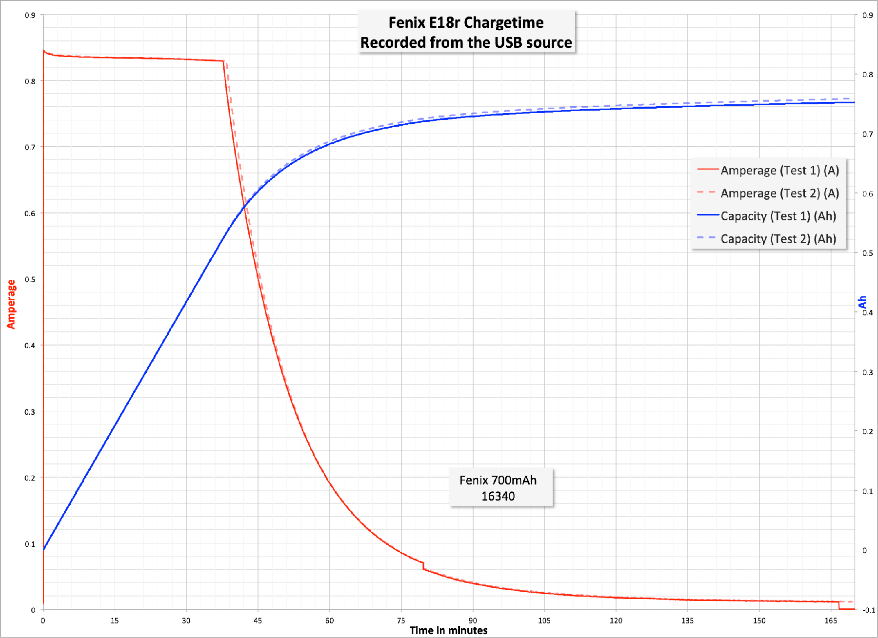 Here’s a charge time test. Charging in the CC phase is around 0.85A (reasonable if a little high for a 16340). The CV phase seems to just trail off into nothing – it takes quite a while for the charge system to actually finish the charge cycle.