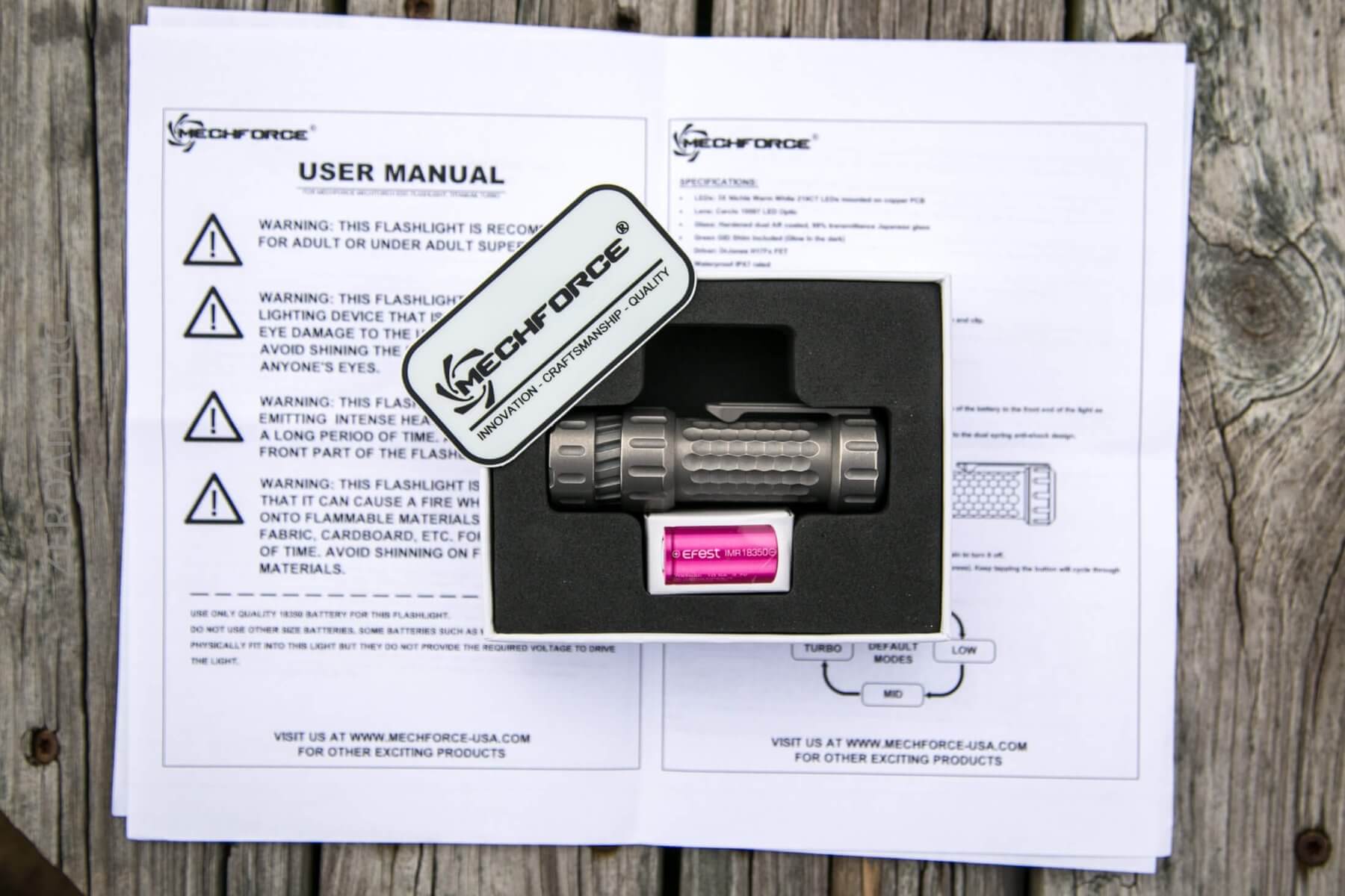 Mechforce includes the cell you’ll need for operating this light. The Mechtorch is a 18350 light, and an Efest 700mAh 18350 is included. I’ve had mixed results with Efest Purple before. When I’m buying, I buy Vapcell 18350 cells because they’re higher capacity (1100mAh plus) and maintain the high current capability.