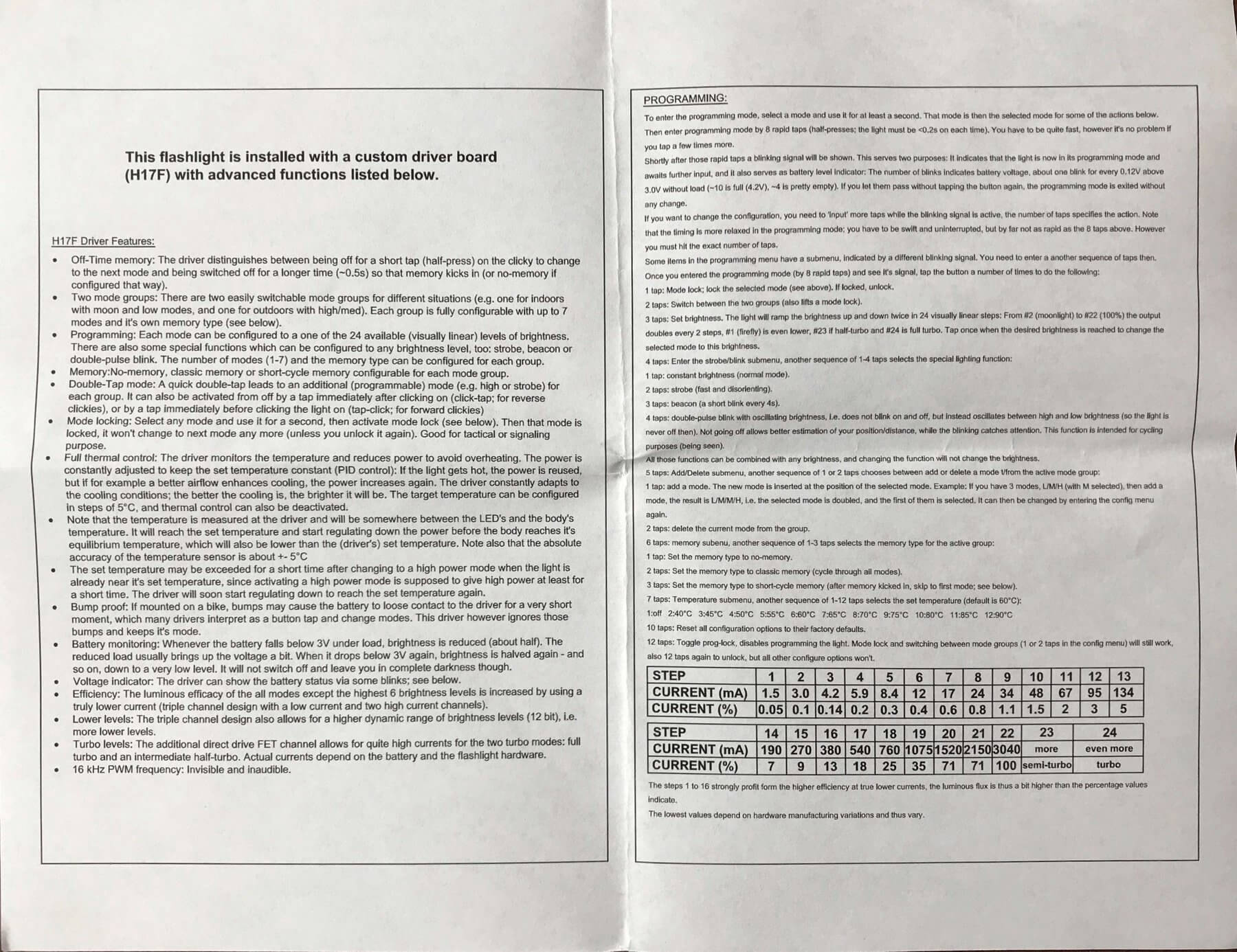 ^ Cell voltage indicator (immediately when programming is entered): Each ‘big’ blink of the emitters is approximately 0.12V, starting at 3.0V. So 1 blink =3V. 2 blinks = 3.12V and so on. 10 blinks = 4.2V.