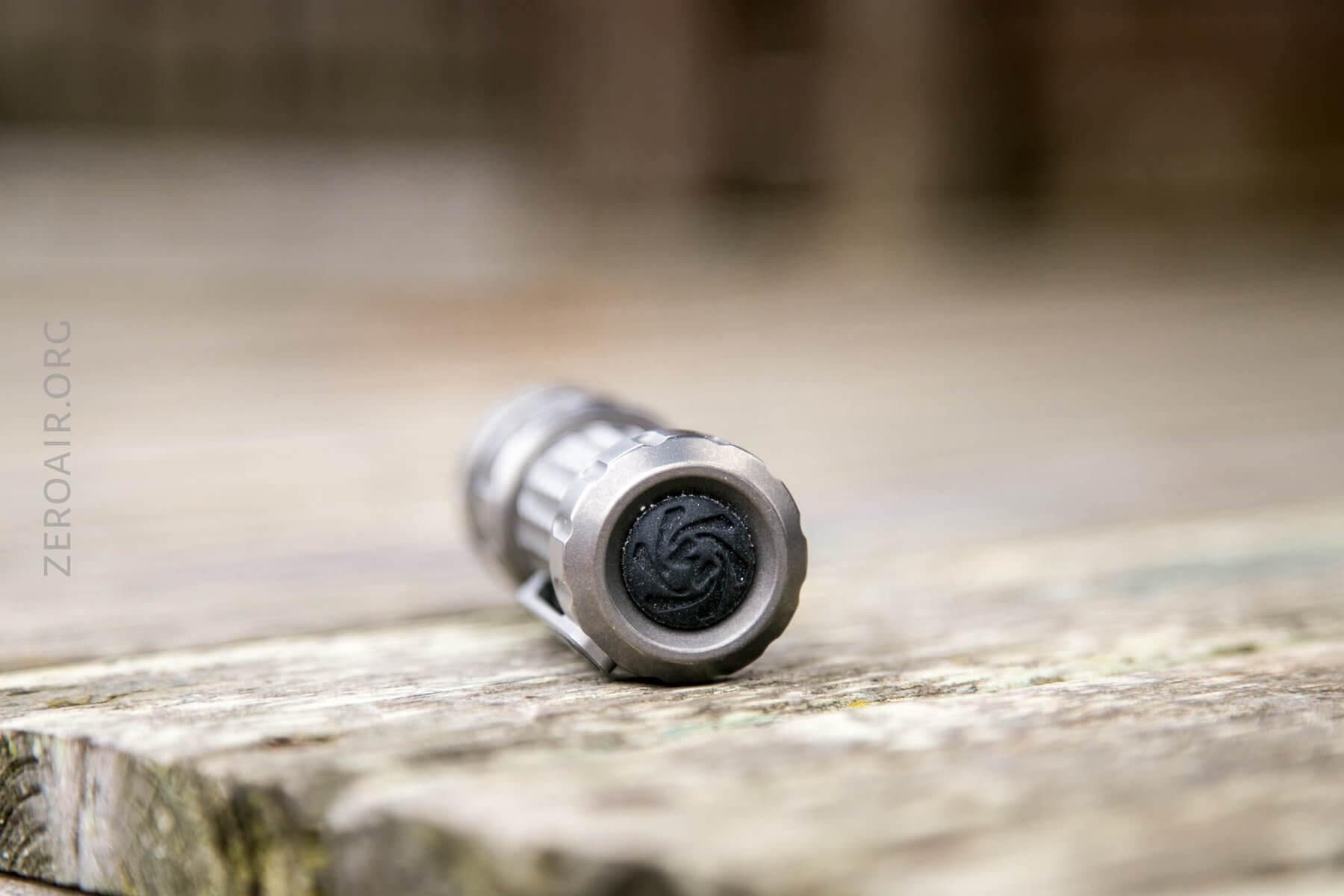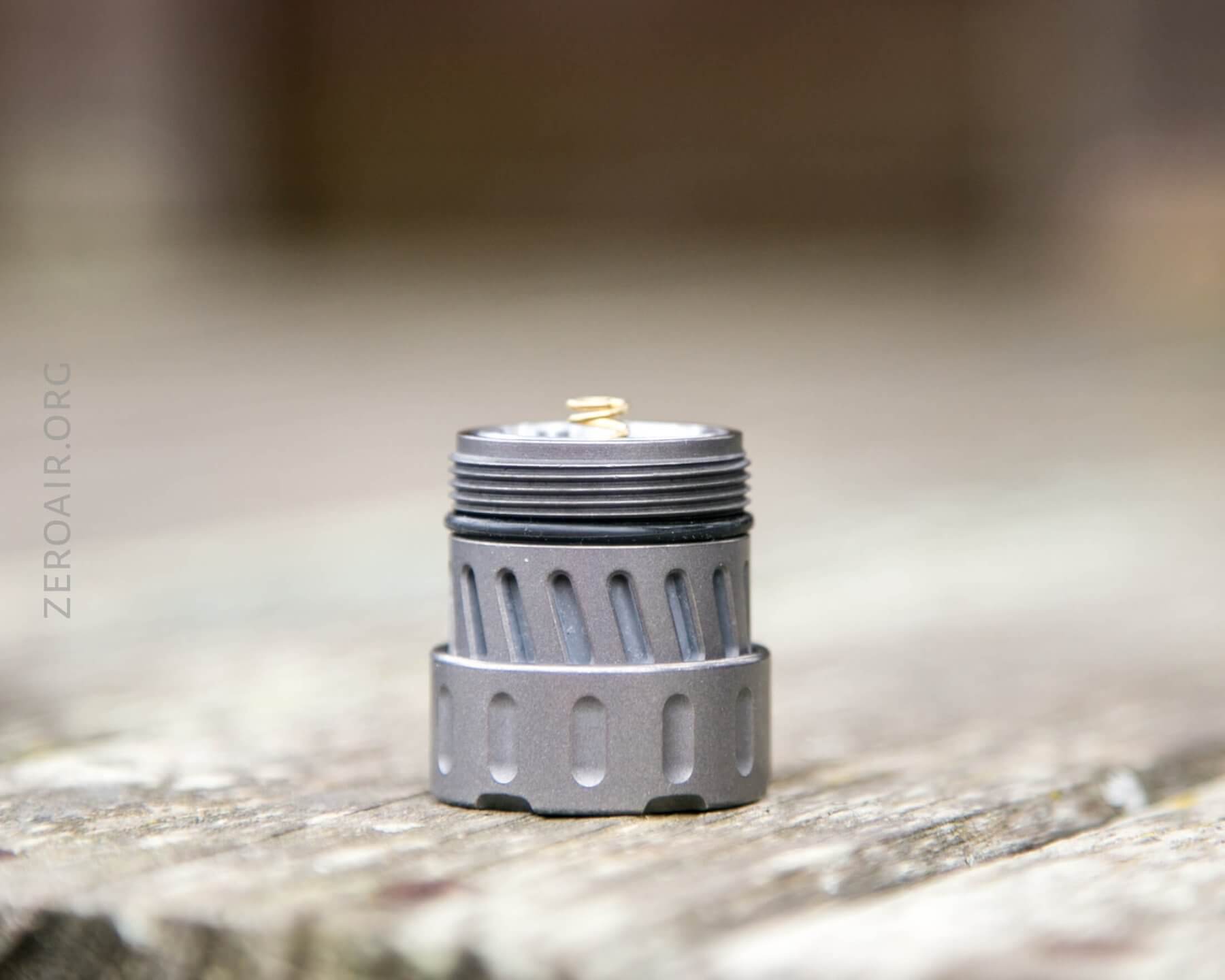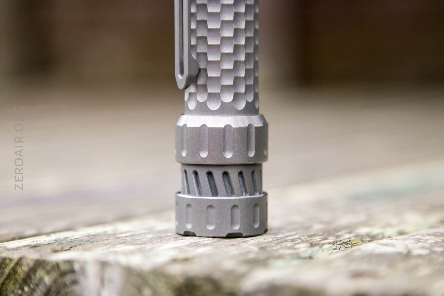The threads, oh the threads. Titanium threads are notoriously gritty. In fact, that’s one thing that confirms this as actual titanium. That’s not necessarily good, but at the same time, these are quite smooth titanium threads. They’re triangle-cut threads, much like just about any other higher-end custom flashlight. Below, have a look at the bezel – it must be removable, but it’s quite confident and happy to stay put exactly where it is, and I didn’t really want to pull it.