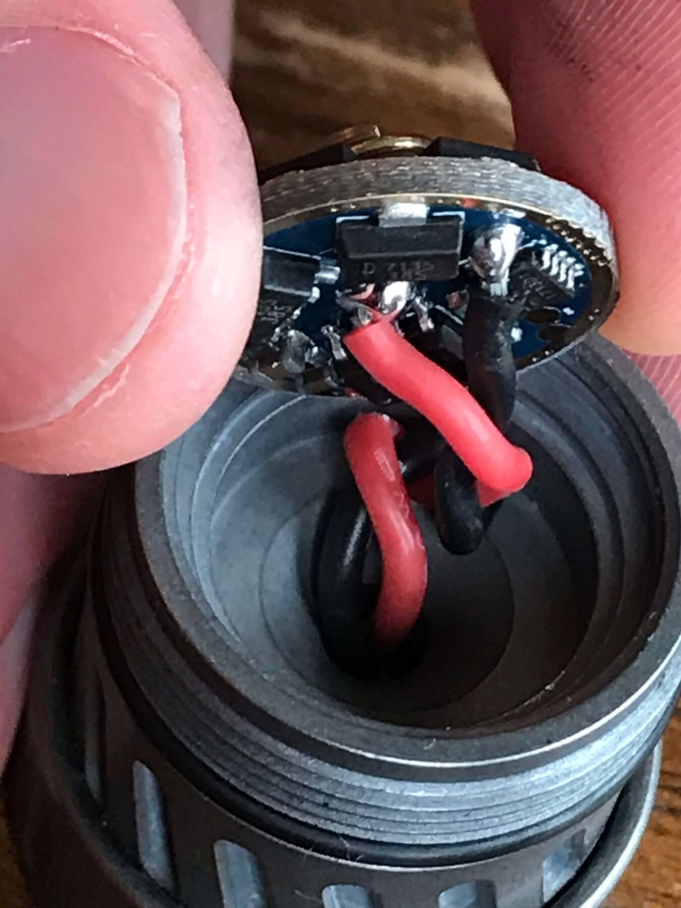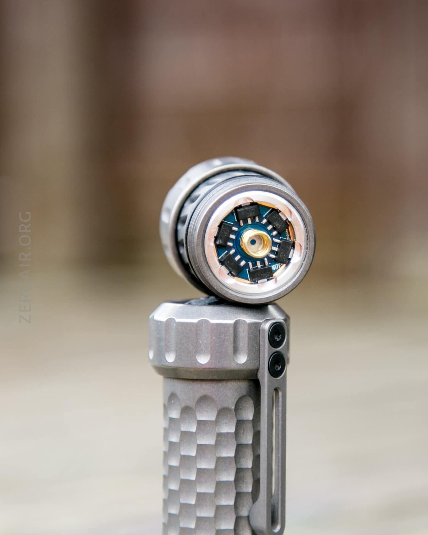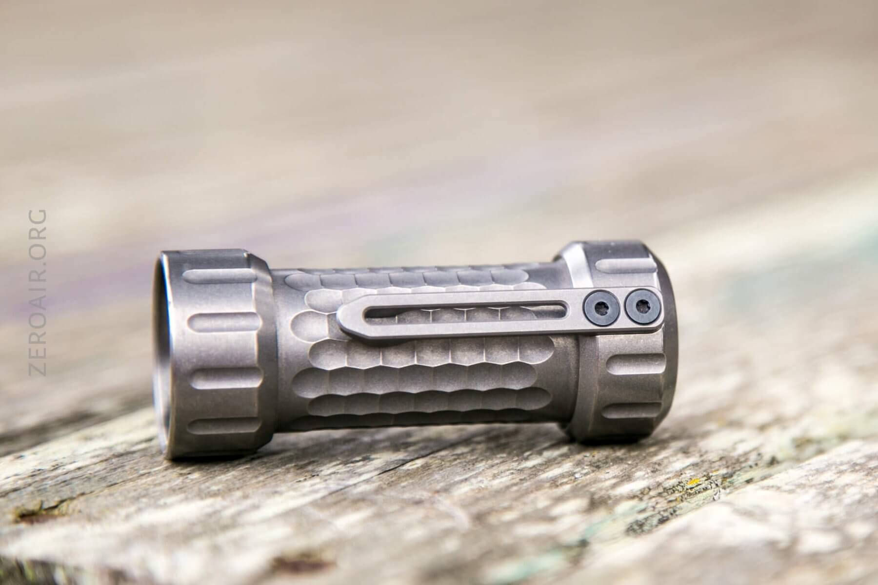 The threads, oh the threads. Titanium threads are notoriously gritty. In fact, that’s one thing that confirms this as actual titanium. That’s not necessarily good, but at the same time, these are quite smooth titanium threads. They’re triangle-cut threads, much like just about any other higher-end custom flashlight. Below, have a look at the bezel – it must be removable, but it’s quite confident and happy to stay put exactly where it is, and I didn’t really want to pull it.