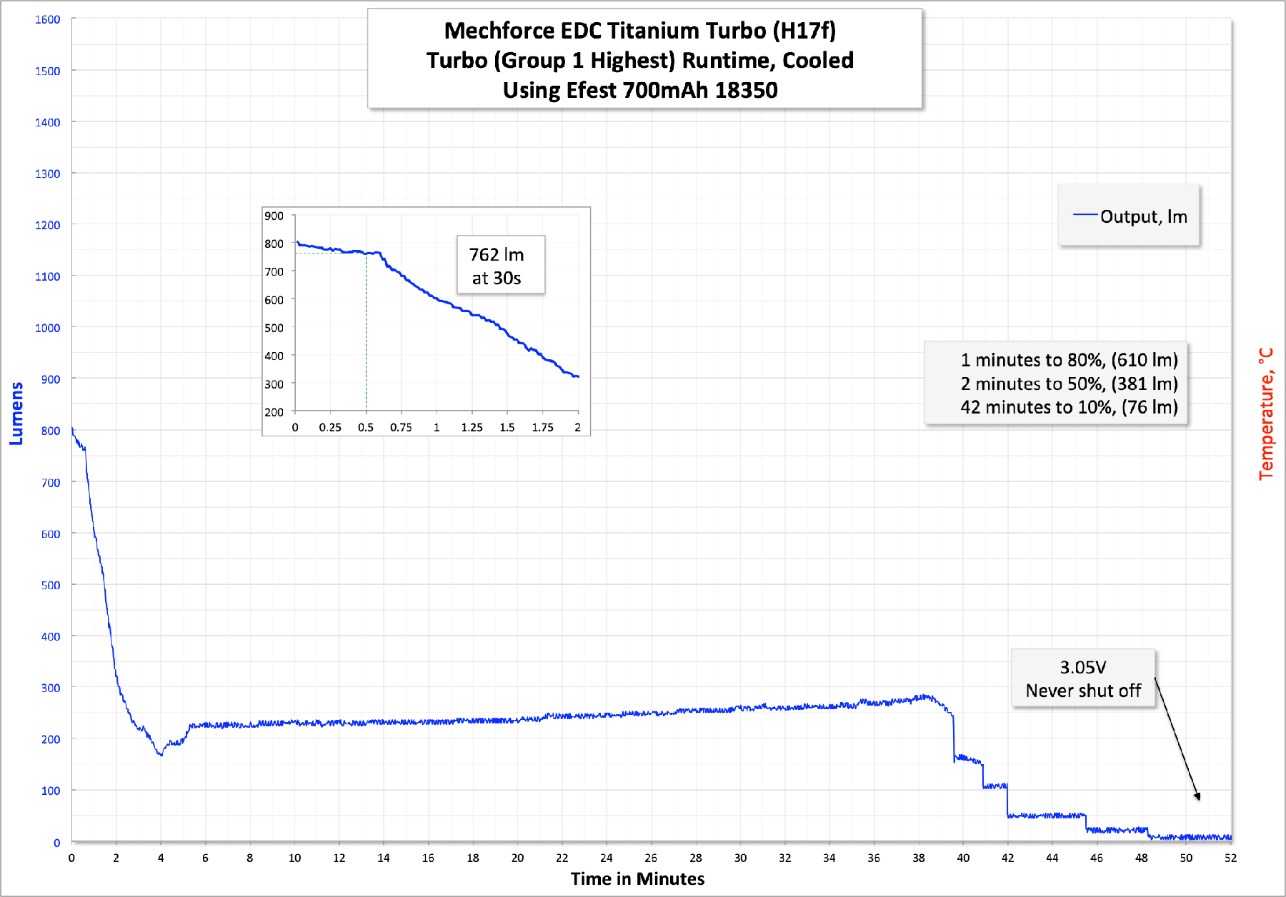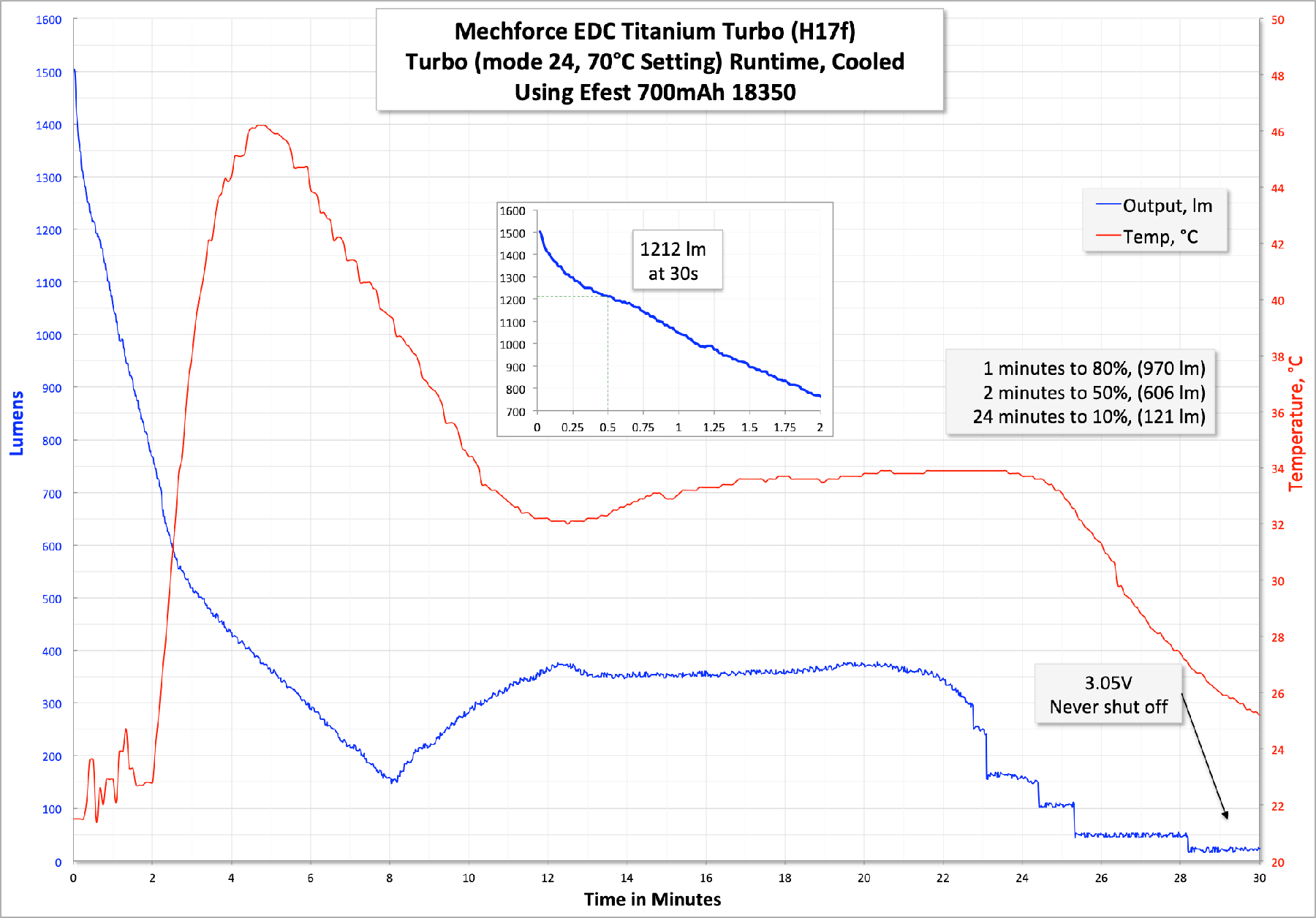 And finally, here’s a runtime on what’s practically the blazingest mode possible, but with still reasonable temp settings. I reprogrammed the light to mode 24, which is as high as the output can be. I set the temp stepdown to 70 degrees C. The output is much higher. Even at 30s, the output is still almost twice what the default is.