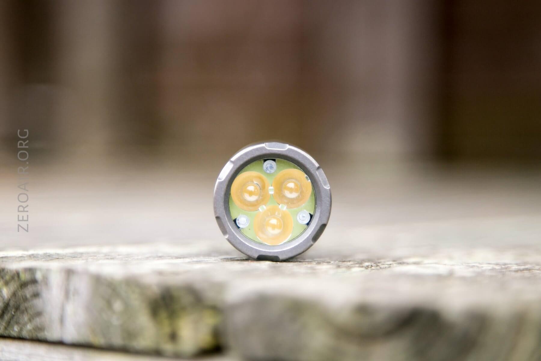 As is just about standard with these little lights, this is a triple. There are no emitter choices, but the stock one is just fine – it’s Nichia 219c in “warm white” (but unspecified). Again, have a look at that glow gasket!!