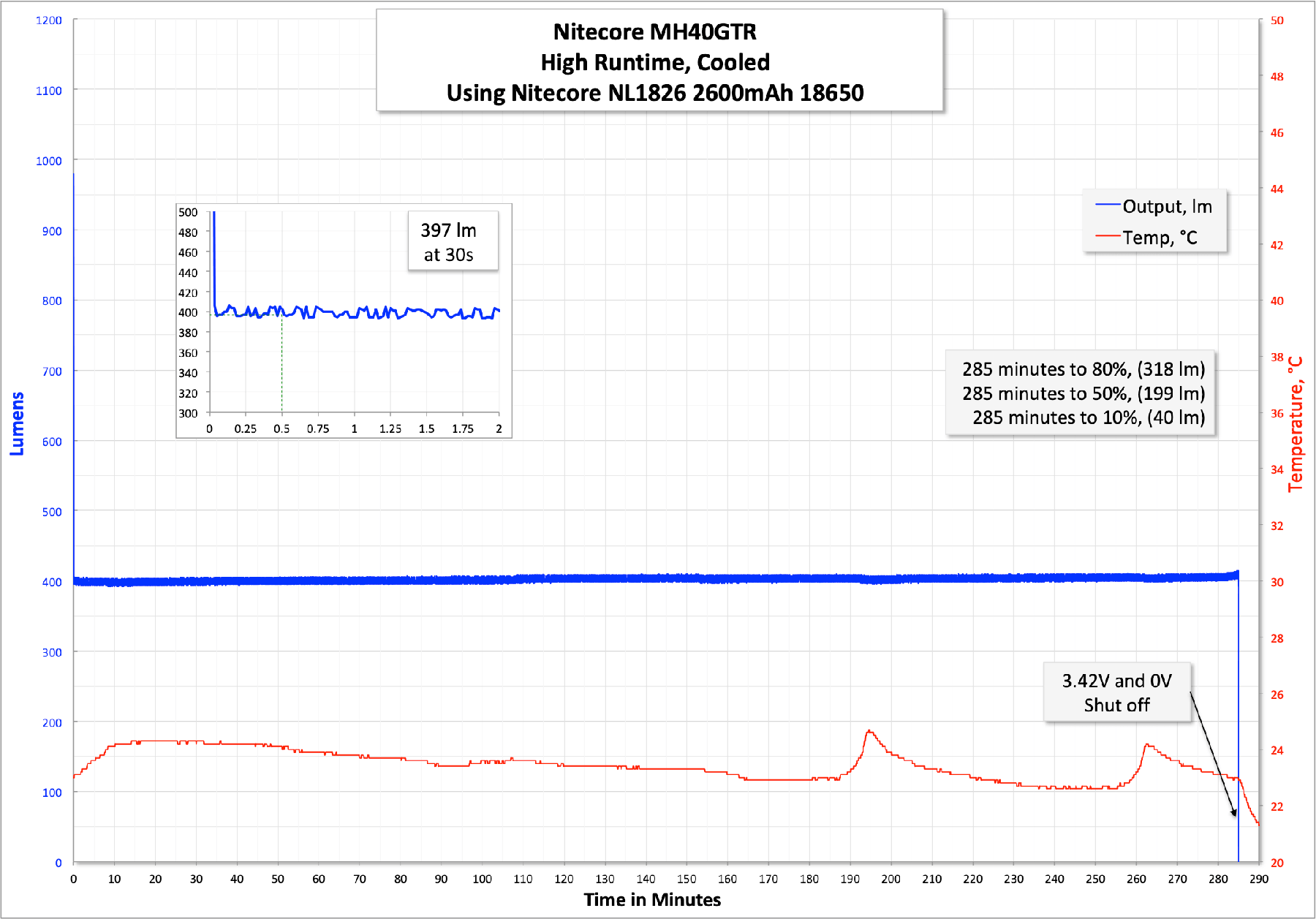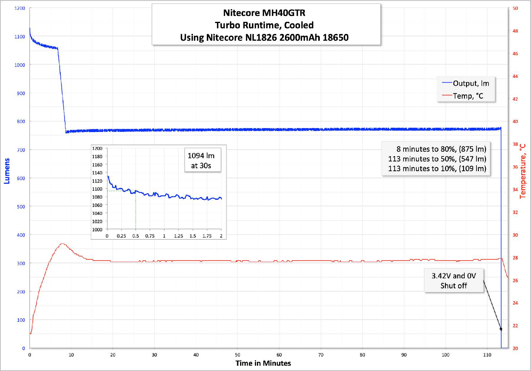 Here’s a runtime on Turbo. As you can see, Turbo holds out for a respectable few minutes, only dropping to 80% at around 8 minutes. Then there’s a dead flat stepdown for another 100+ minutes. Also, note the temperature never blips over 30 degrees C…. not very warm to the touch at all!