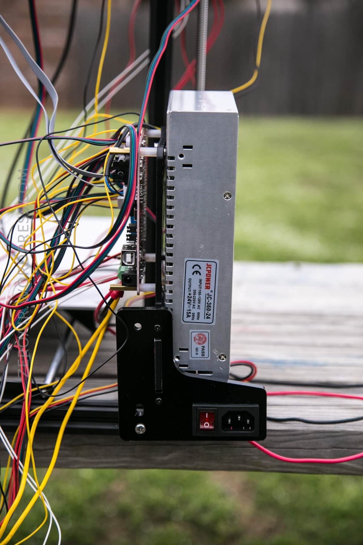 The DC side of power is included, too. This is a nice (expensive) DC power supply that outputs up to 15A at 24V. This power supply handles power for all of the parts in the unit (including the heated bed).