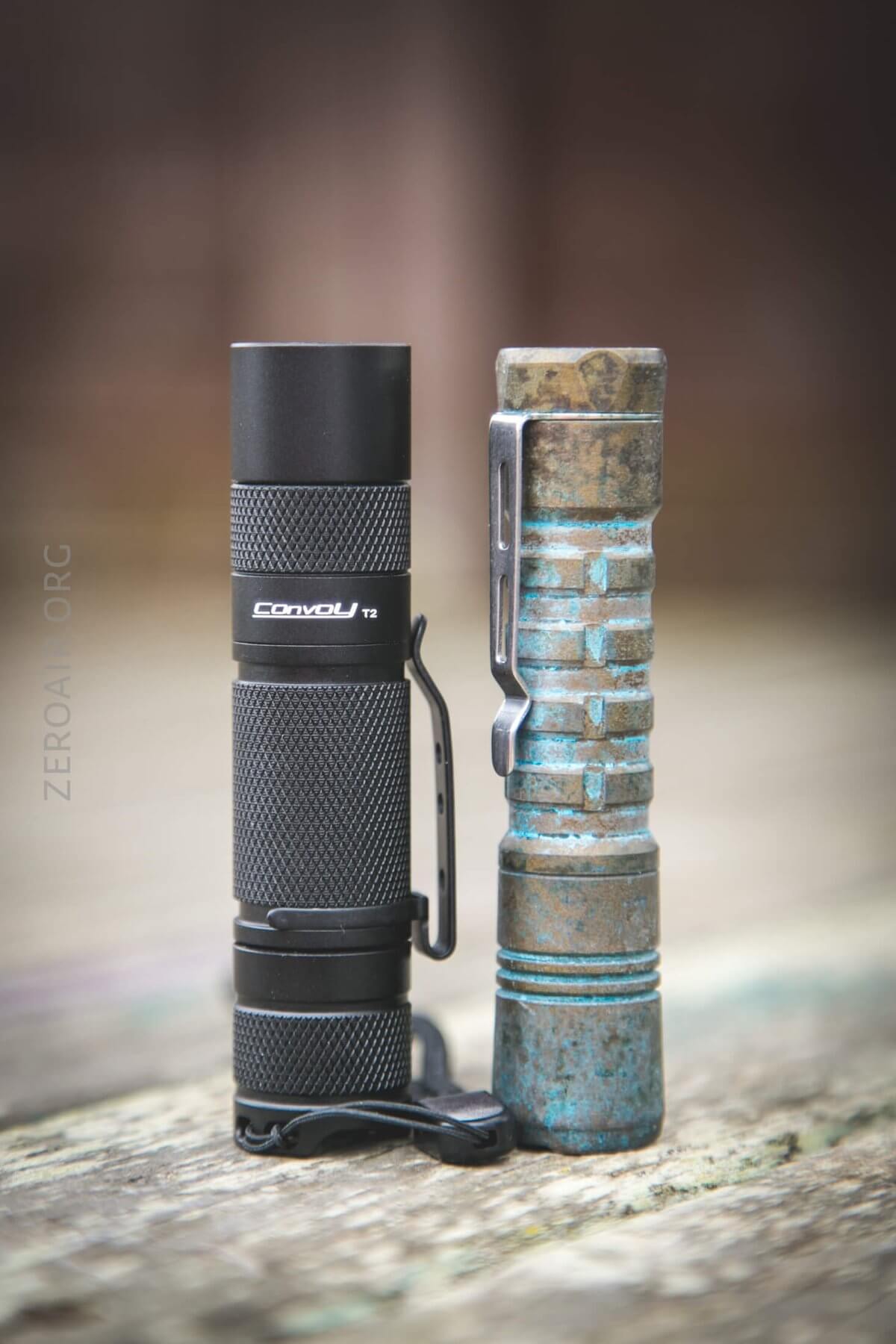 And here’s the T2 compared to another random AA light – the ReyLight Pineapple. With a bit of custom patina.