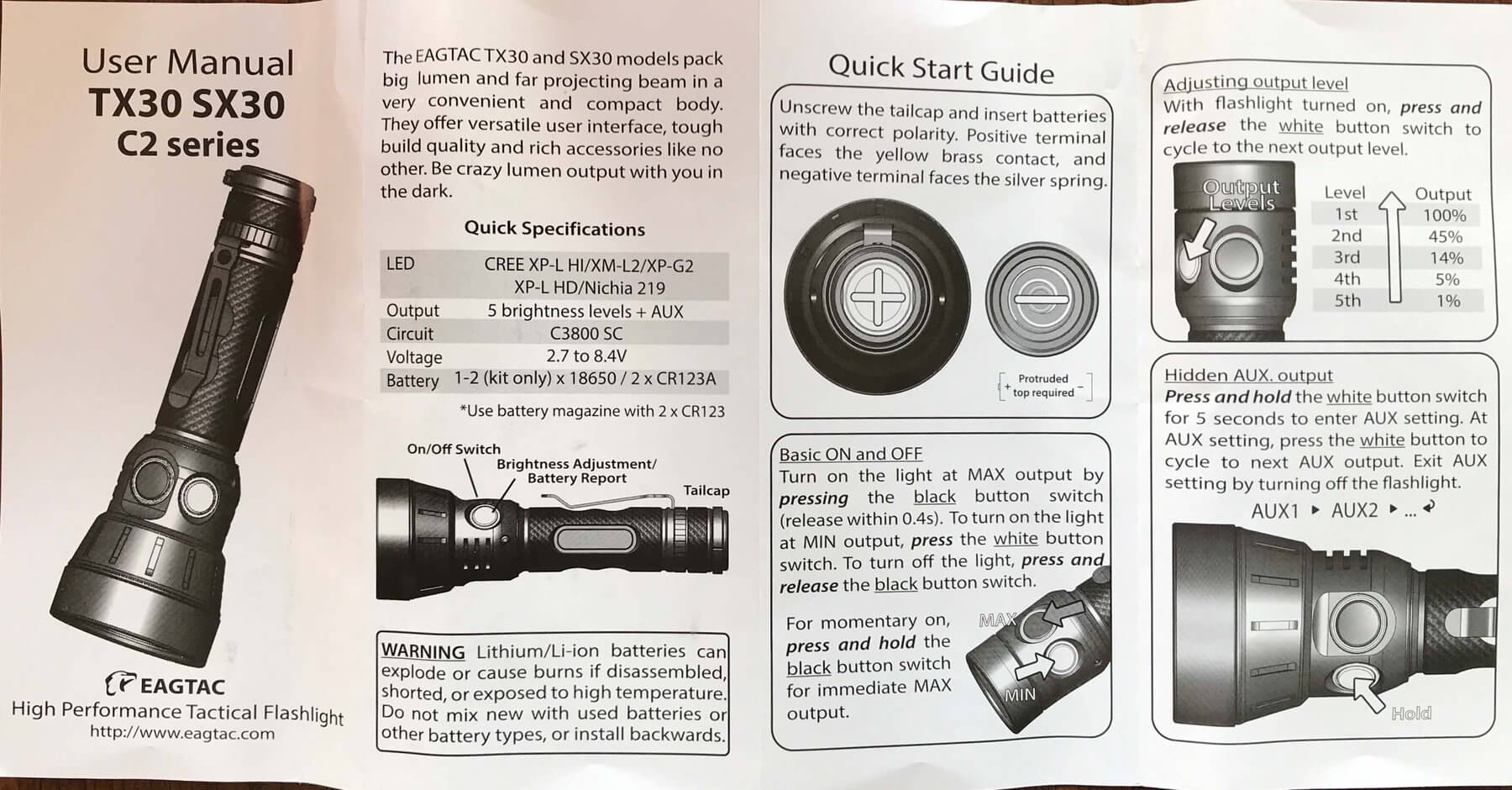 Here are some shots of the manual. It’s all in English and a two-sided fold-out paper. The manual actually services all the lights in this build series (TX30C2 and SX30C2.)