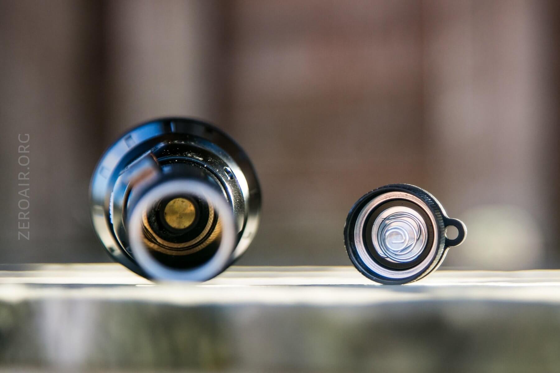 The tailcap has a spring. The head end has a spring, too, but it terminates in a button (so it’s a spring, even though it looks buttony below). The tailcap spring isn’t quite as stiff as I’d like, but with both ends having springs, this isn’t a big issue. It’s hard to see that positive connection, but the brass button has a plastic ring around it. Looks like that’d be a physical reverse polarity protection, but it doesn’t seem to be; flat-top cells work fine. (The manual does say “protruded top required,” which would indicate that they do want us to use button tops.)