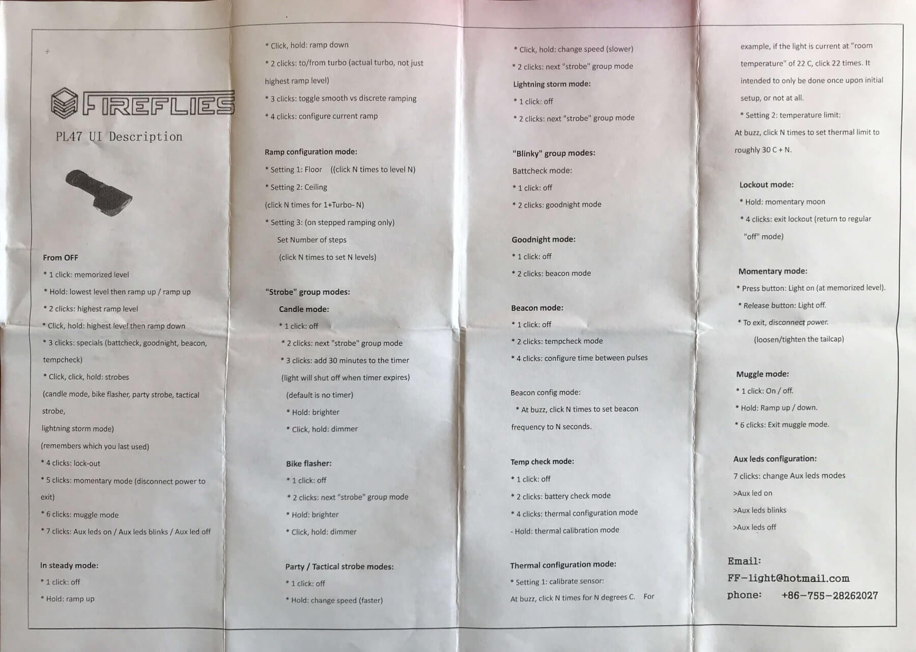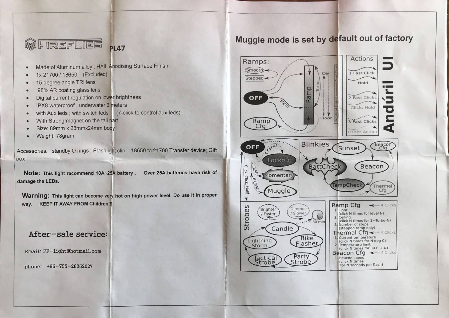 The manual is a one-page paper printed front and back. It includes the user interface graphic by ToyKeeper, and some other very useful information (like not to use a cell over 25A, or you could damage the emitters).