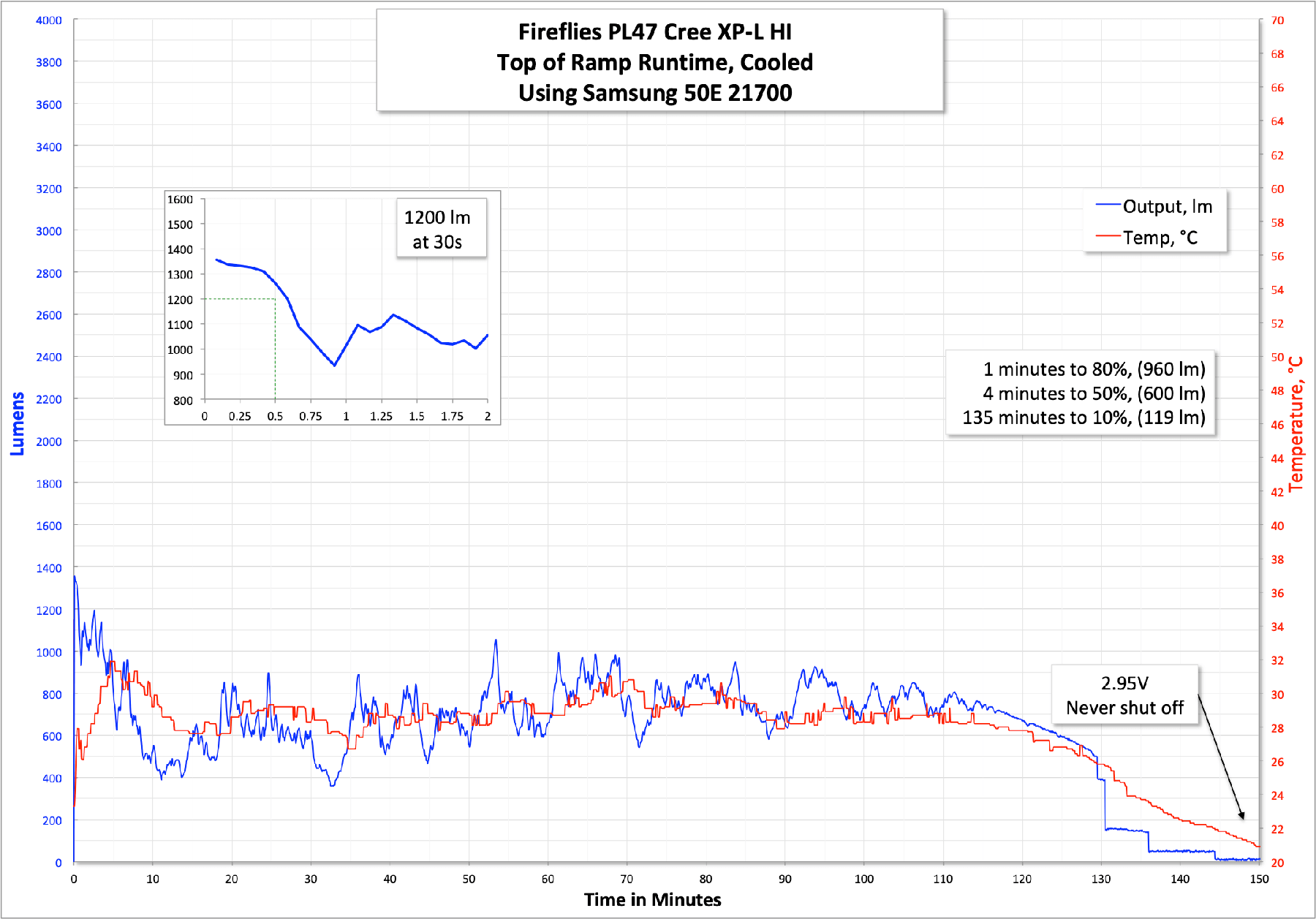 The light steps down so fast that the majority of the high output has already passed by the 30-second measuring point. So I read the light as 1728 lumens (at 30 seconds), not the extraordinary ~4000 lumens at startup. I can’t really explain the sawtooth runtime. I didn’t notice anything unusual in the output during the tests (they’re both like this) but then the setup is designed to capture all the light anyway – if it’s set up right, then I won’t really see any light anyway. The output seems to be moderately responding to temperature, which could easily explain the unusualness of the chart.