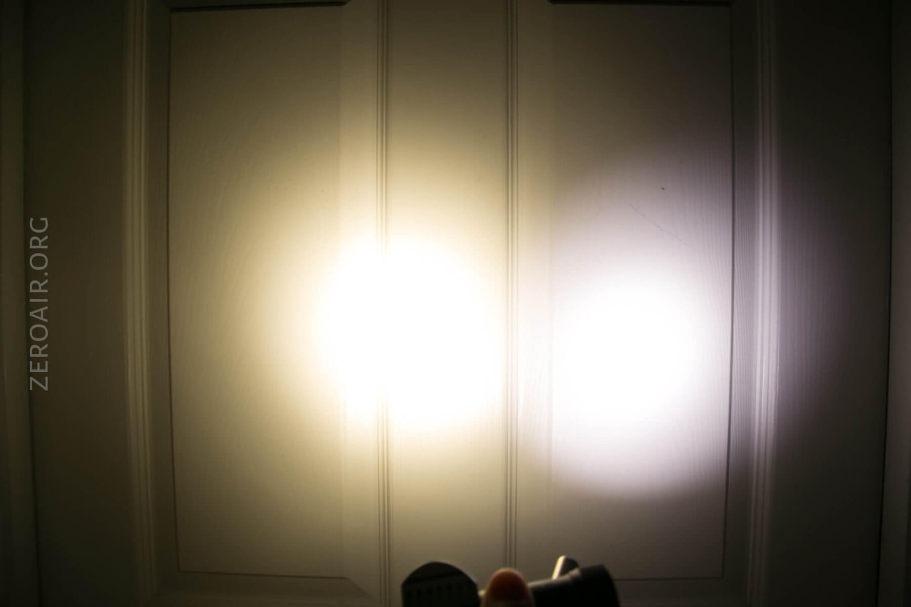 Though there are many choices, my sample has XP-L HI in 4000K temperature. Cree XP-L HI 4000K is practically my favorite emitter (aside from a select few Nichia 219b). These emitters are behind a clear optic and provide a beam with a fairly tight hotspot, fading into a bit of spill.