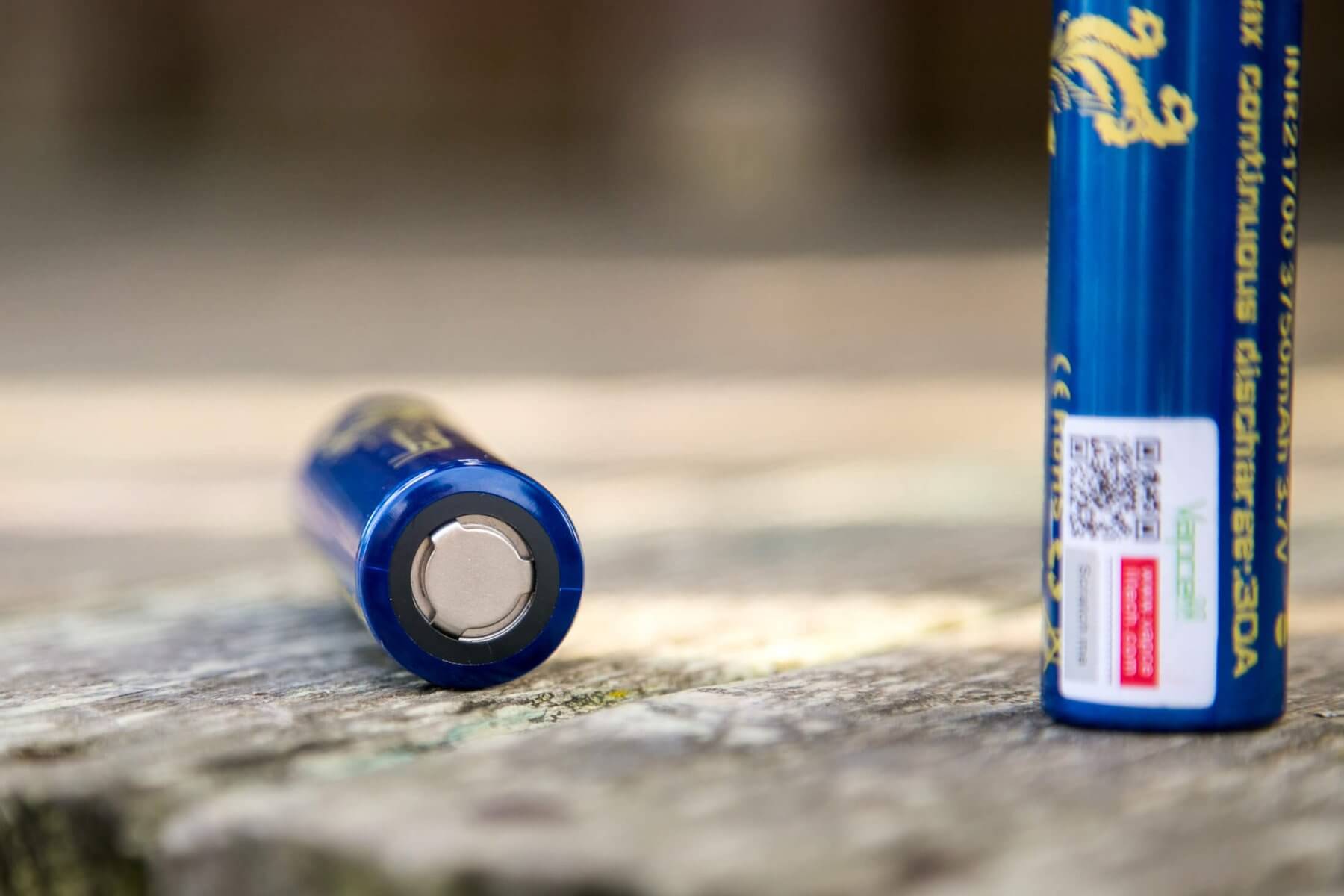 This Vapcell 21700 cell has a flat top and a nice blue and gold wrapper. It’s high-current-capable, but read on for testing!