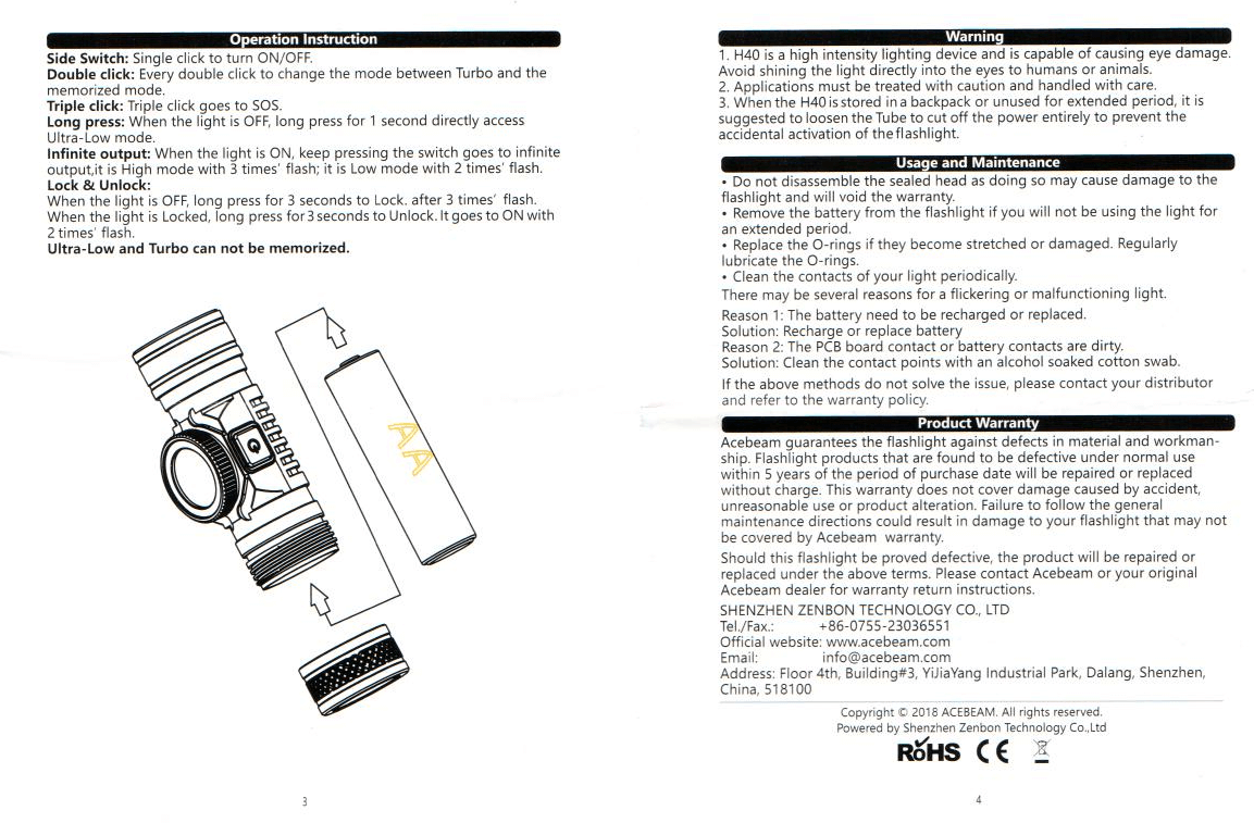 Acebeam ships this light in a display-ready slip-fit box. Inside the box is some foam, holding the pieces very carefully. The back of the box is very informative, including output and runtimes for both emitters and 3 supported cell types.