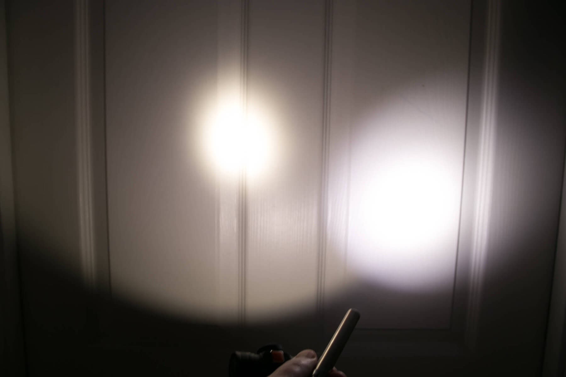 The reflector is small, of course. It has an orange peel texture. The small size of the emitter, coupled with this reflector, gives a surprisingly tight hotspot, but there’s a reasonable spill, too. This light will likely be good for hiking and on-trail activities.