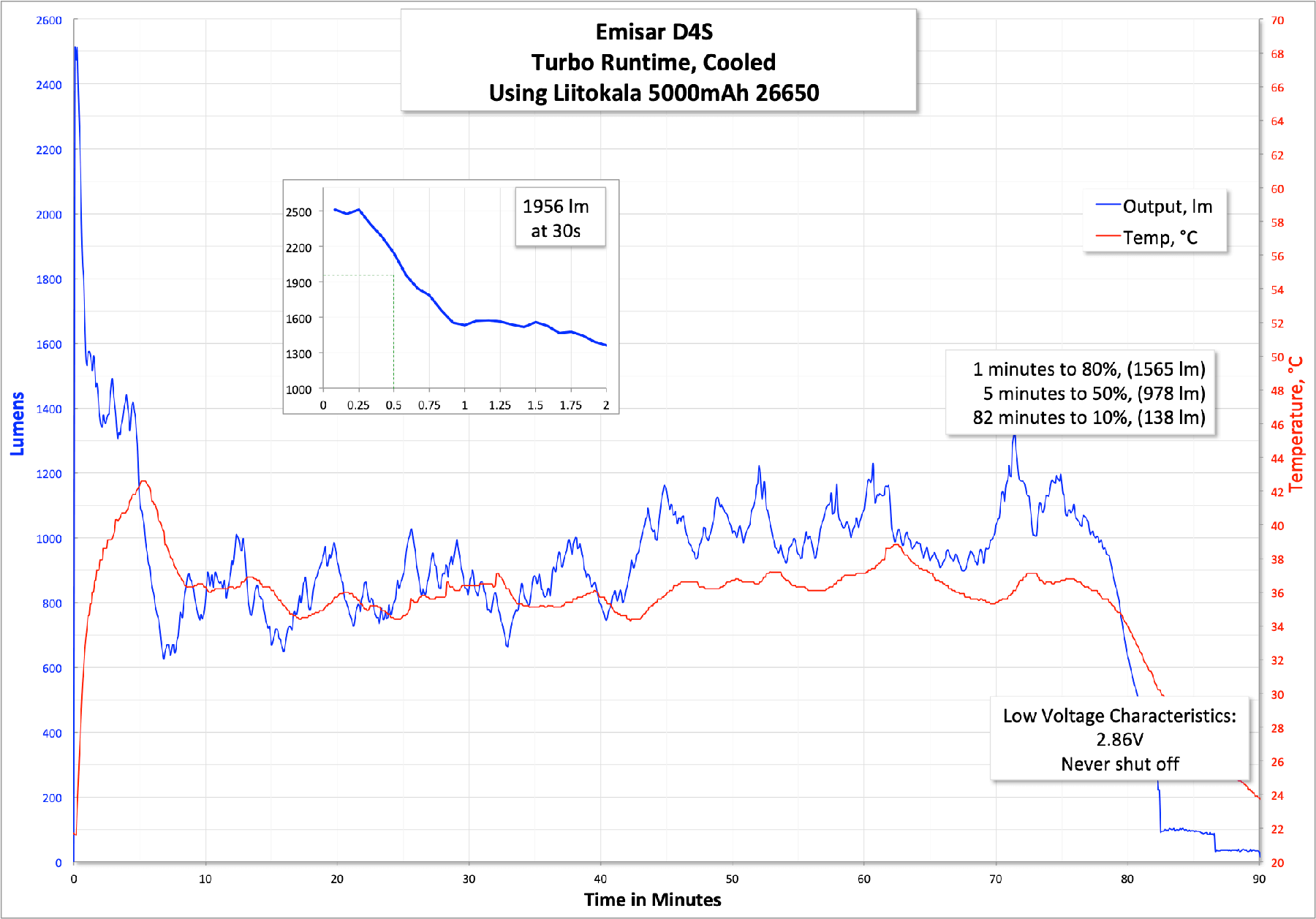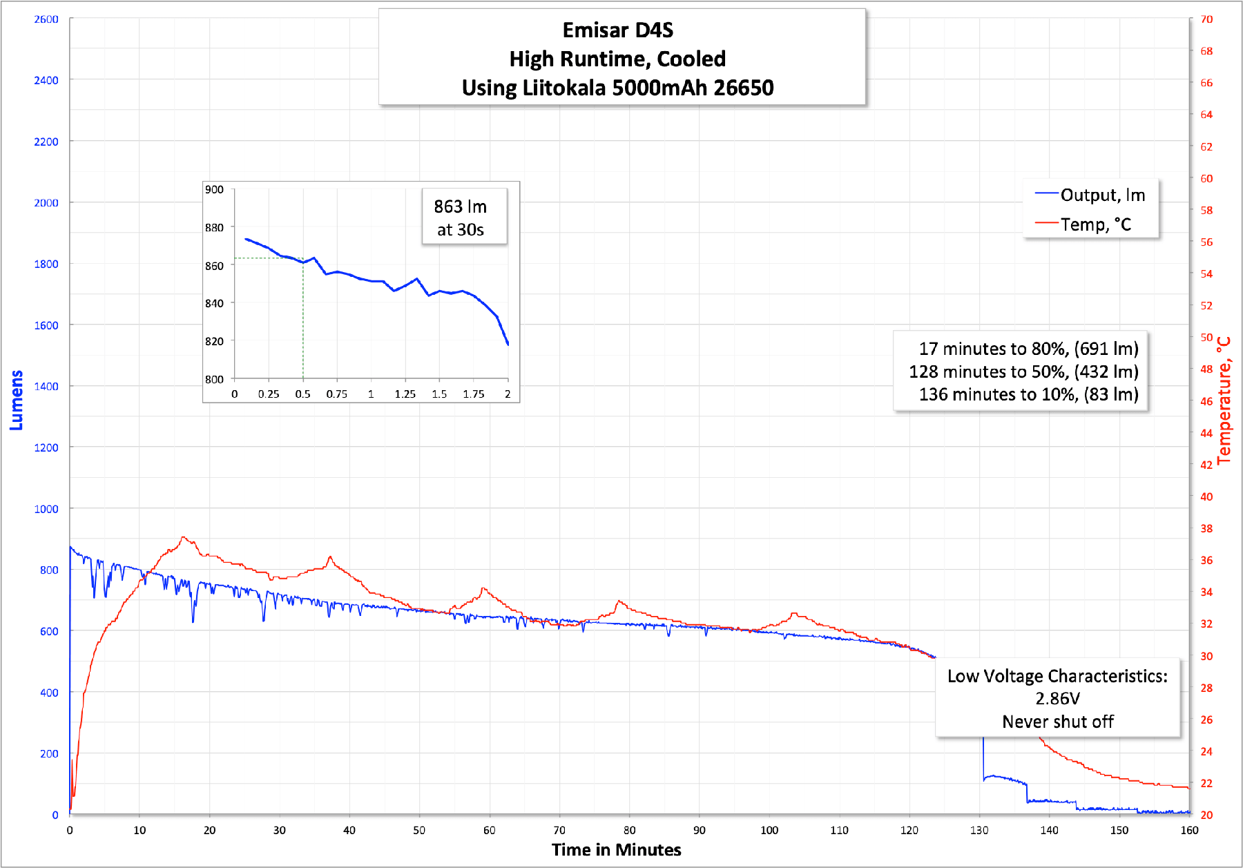 Also noteworthy is that the light tests quite a bit under the claimed output. That’s entirely cell-dependent, and I suppose this Liitokala cell doesn’t provide the current needed for long enough to maintain the initial output (of 2500 lumens), or hit the max claimed output of 3000 lumens. If I were you, I’d probably snag a different 26650 for this light, if your goal is max lumens for the longest time.