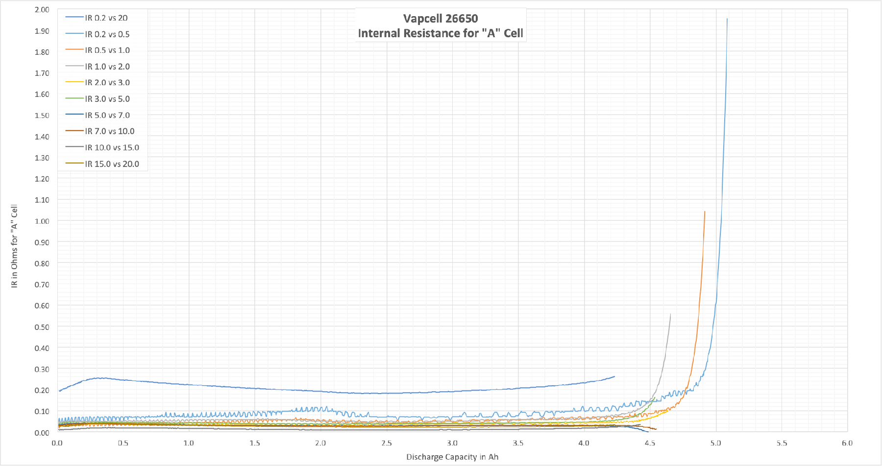 “Bounce back” is what the cell voltage does when the cell rests after a discharge. Interestingly, after heavy discharge rates, the cell bounces back higher. This corresponds to a discharge amount of less energy, and does mean that there’s energy left in the cell. So if I selected the cell with the highest bounce back (i.e., the cell that was discharged at the highest current), then discharged it to 2.8V at 0.2A, I’d still find that there was a lot of energy still in the cell. And I have finally figured out what I think is so interesting about “bounce.” A poorly performing cell will bounce back higher on high discharges. That’s because the IR is higher, and because the cell performs much worse under high loads. So a good performing cell (like this one) will bounce back much less because it’s much more capable of high discharge. And we can see that here. This cell is capable well past the tested 20A, and so at 20A, much more of the energy is used from the cell. Hence, less bounce. I don’t really have anyone else telling me that, so I could be grossly wrong. Or maybe I just proposed a new metric for cell quality. ¯\_(ツ)_/¯