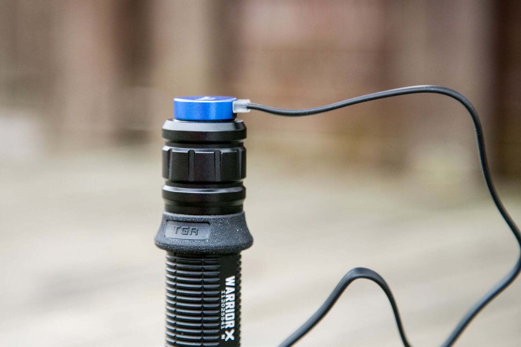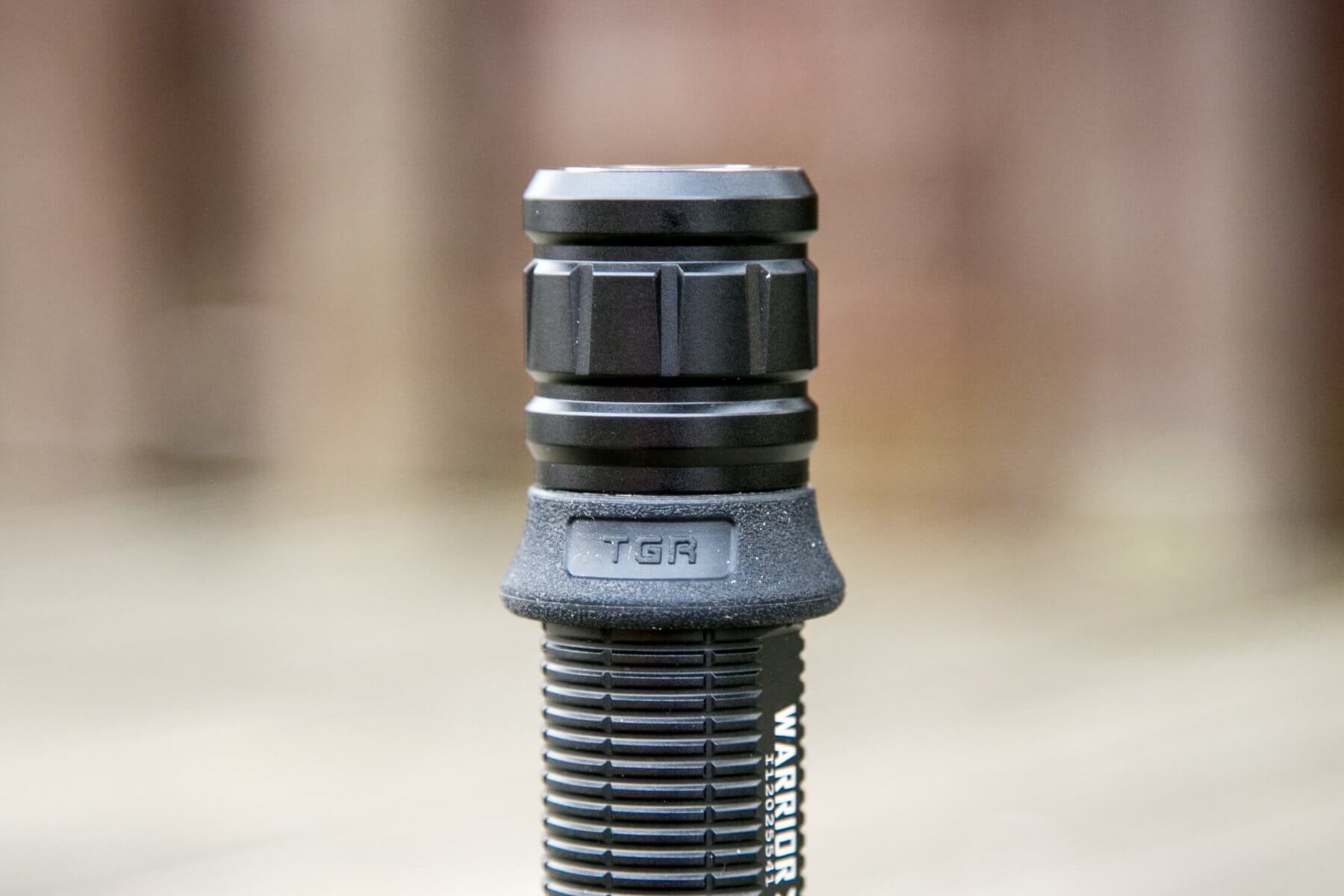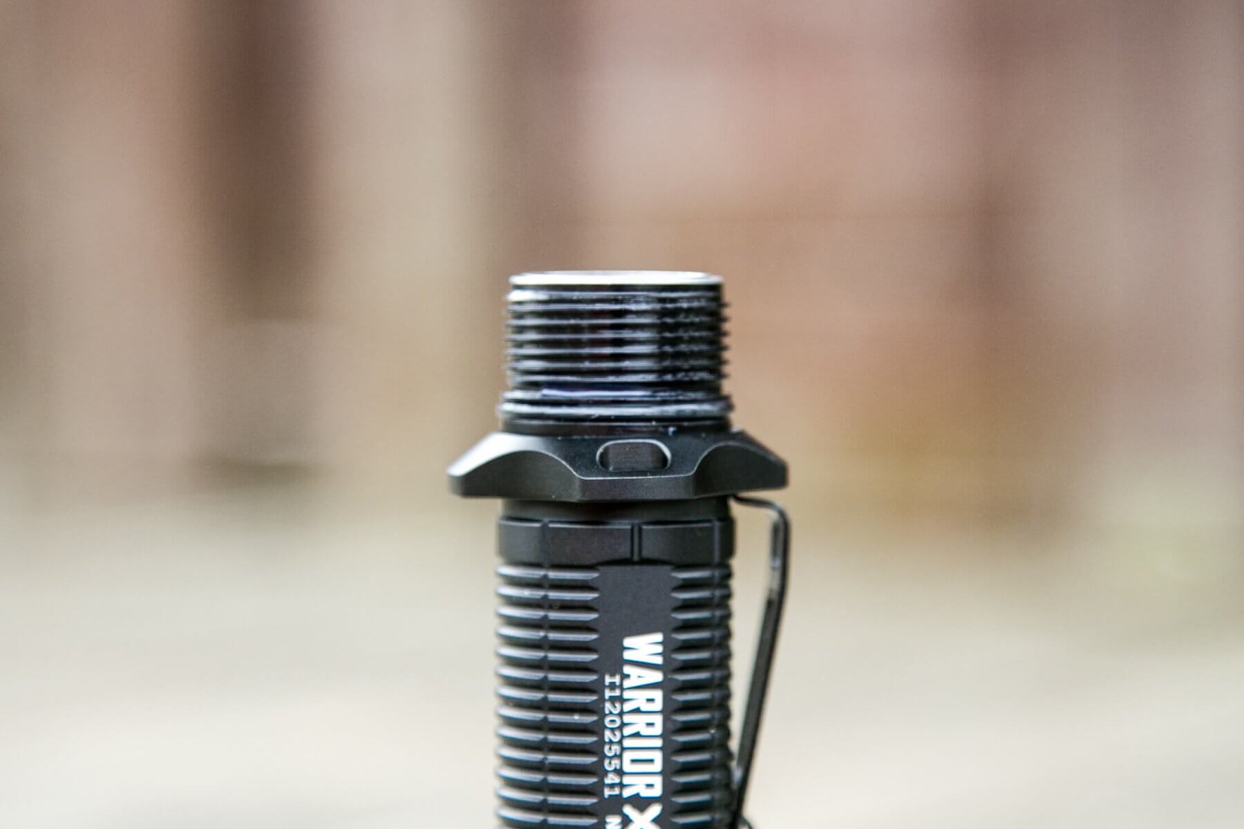 There is only one switch on the Warrior X. It’s an e-switch on the tailcap, the center metal part of what you see below. You’ve seen this switch before in the M2R Warrior. The switch is the same, but the UI is very different.
