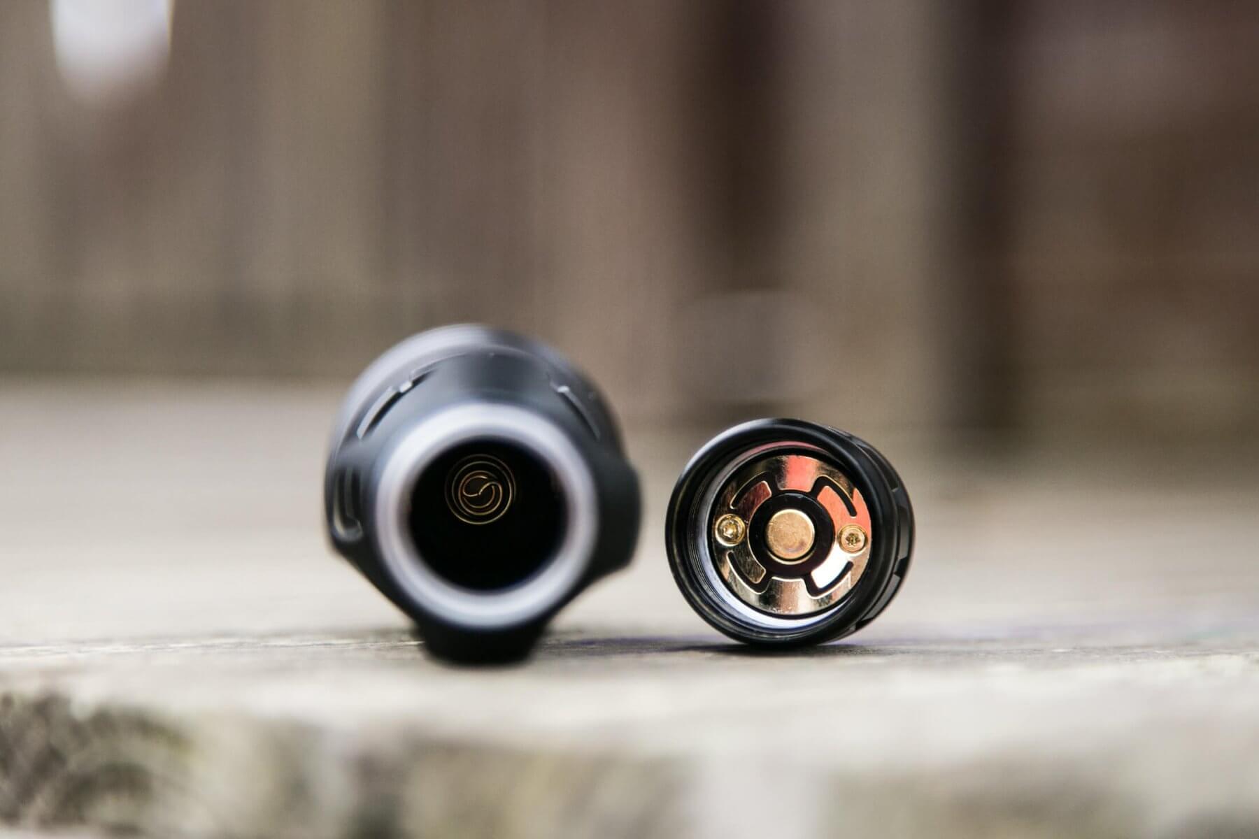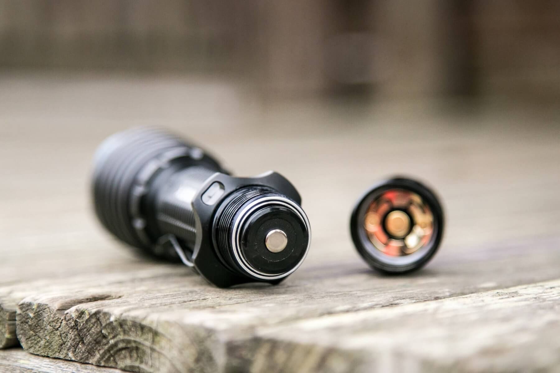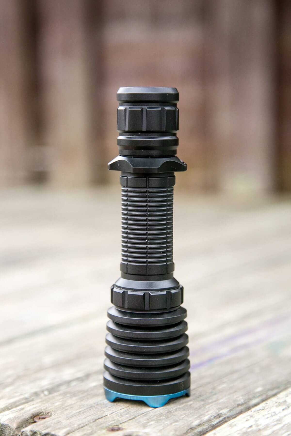 There is only one switch on the Warrior X. It’s an e-switch on the tailcap, the center metal part of what you see below. You’ve seen this switch before in the M2R Warrior. The switch is the same, but the UI is very different.