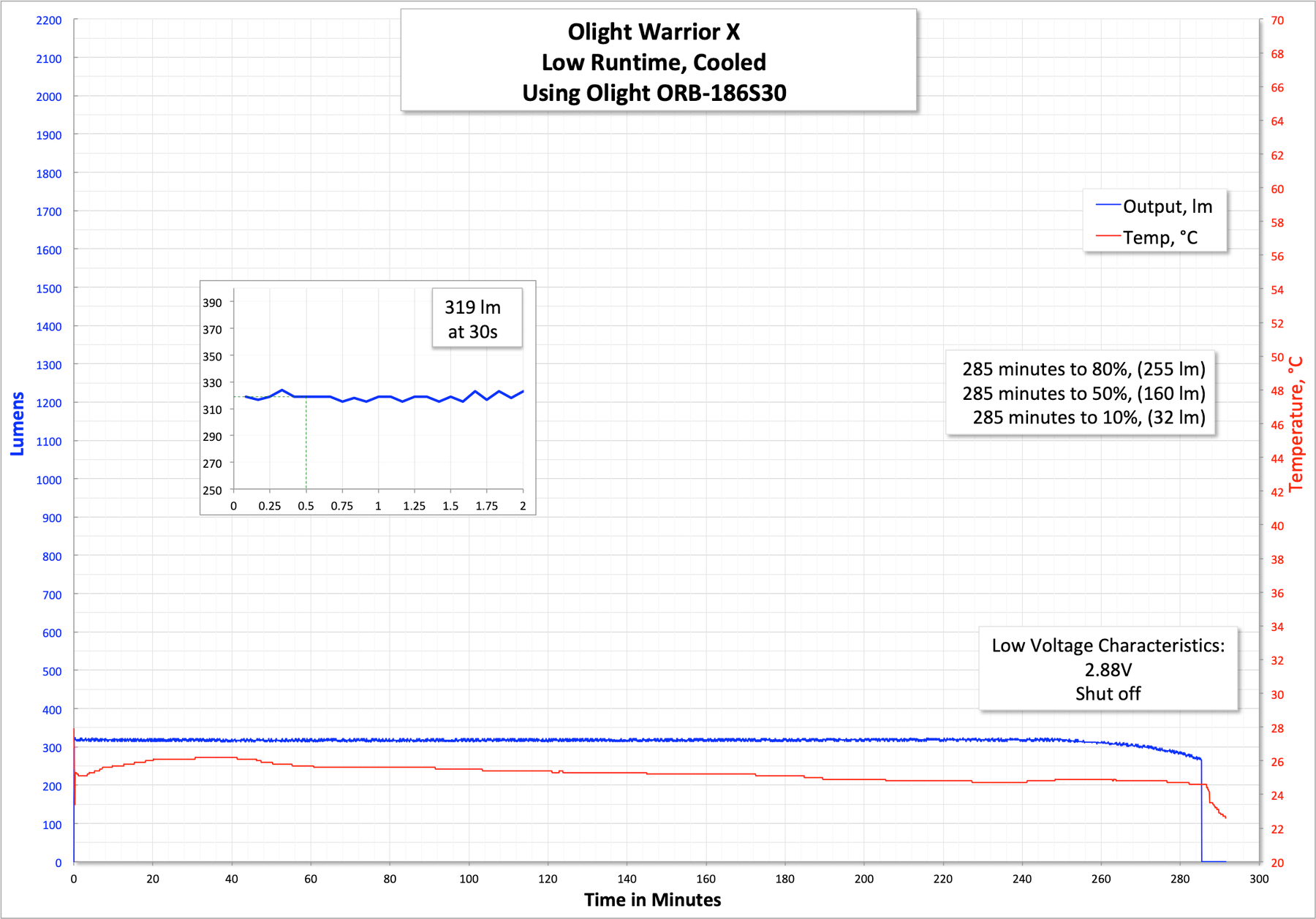 Here’s a runtime on Turbo. The initial output is maintained for a respectable amount of time, and seems to step down in response to temperature. When temp drops, output rises. Again, respectable. The light does have LVP, and I measured the cell at 2.88V when this test was completed.
