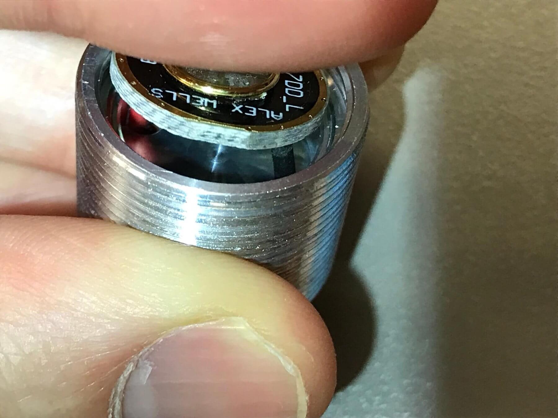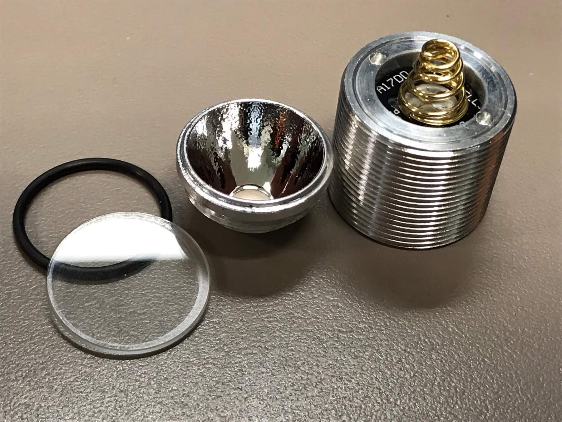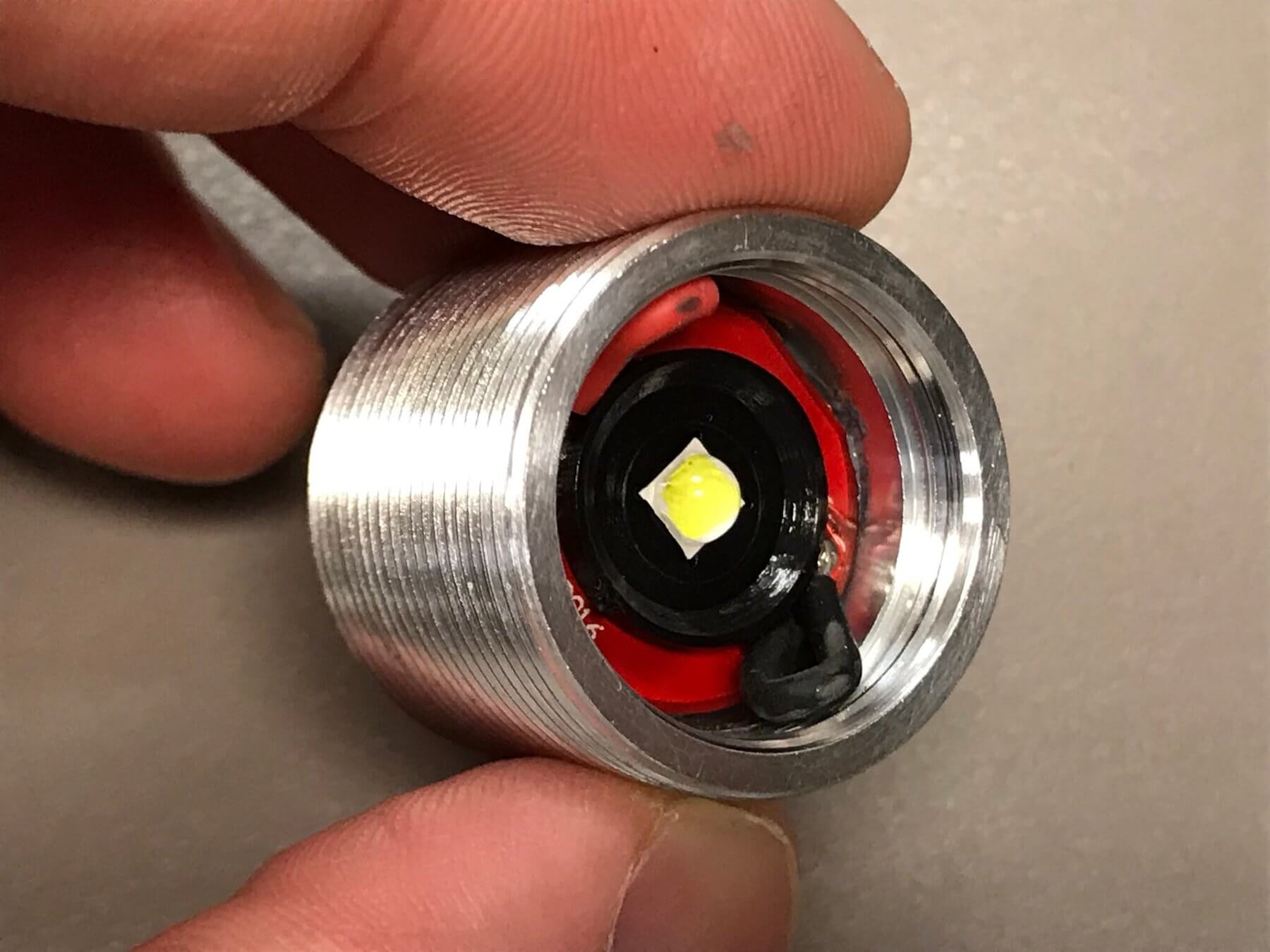 There’s an aluminum pill housing all the electronics and emitter. The driver is held in place with an aluminum retaining ring and is removed easily. The pill has an aluminum shelf. Read on, but for now, know that these are all good choices by the maker – it’s easy to get at the guts. The driver is a BLF A17DD and is a 17mm driver.