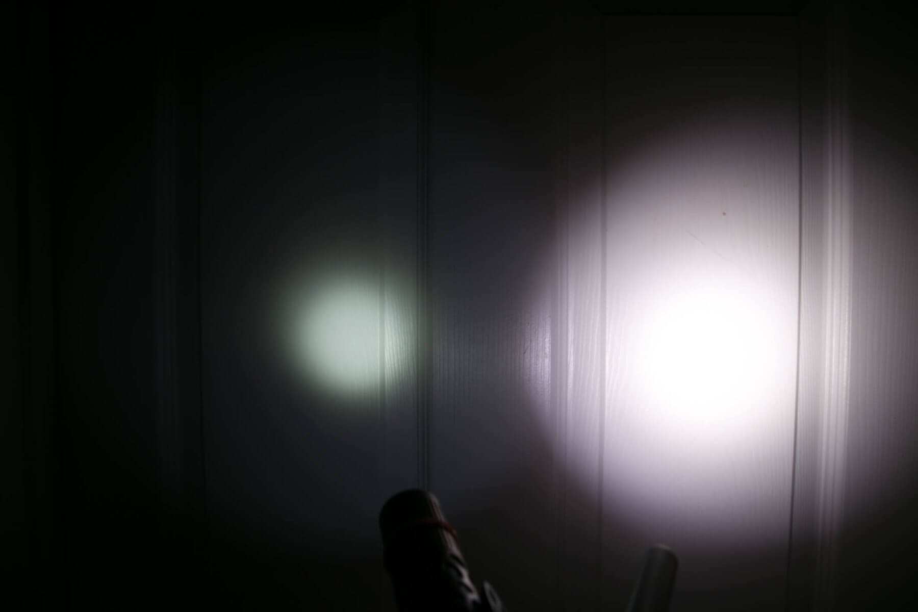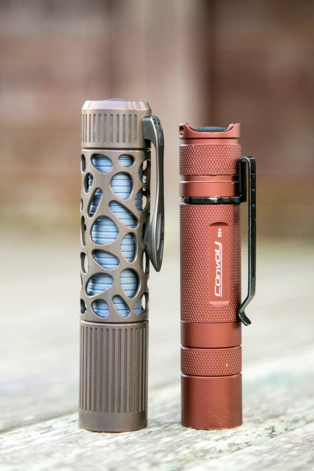 This is a big light, make no mistake. Unfortunately, it’s much bigger than the Convoy S2+, which is already big for its class. Here’s the test light with the venerable Convoy S2+. Mine’s a custom “baked” edition Nichia 219b triple. A very nice 18650 light.